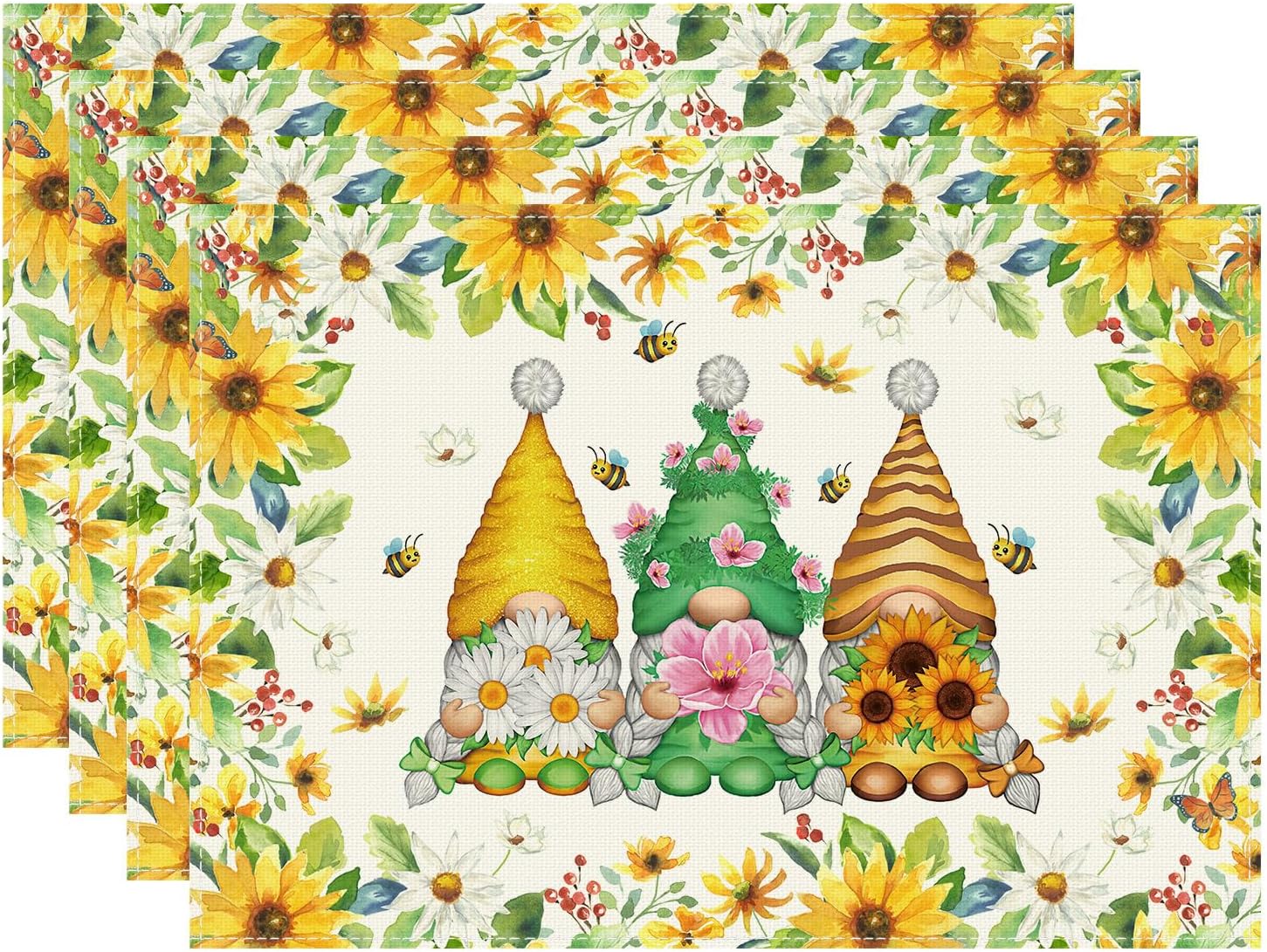 XCHI Daisies Flowers Gnomes Spring Placemats Set of 4 Table Mats Summer Seasonal Table Decorations 12x18 Inch