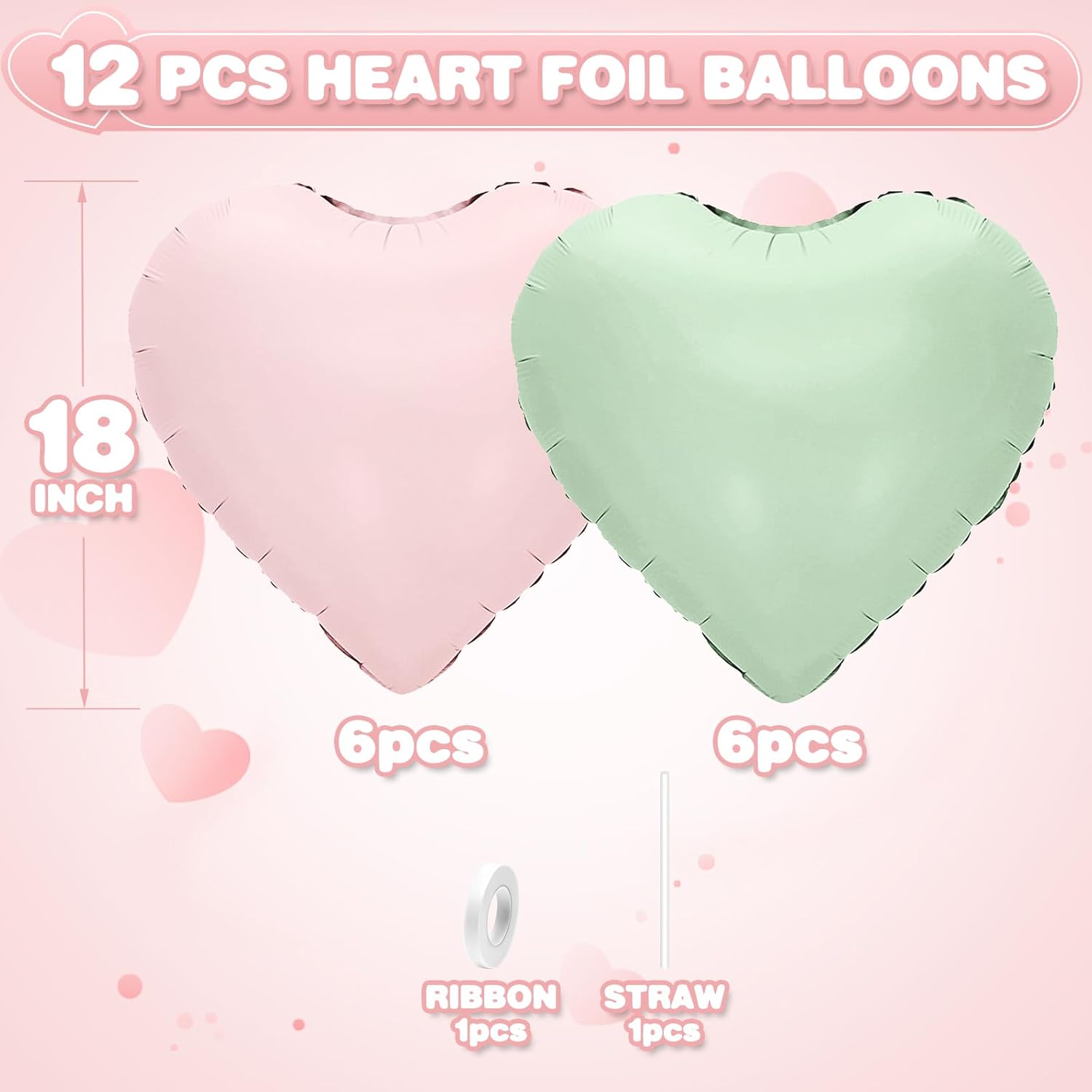 - 12PCS HEART BALLOONS:Package include 6pcs baby pink heart foil balloons,6pcs olive green heart foil balloons,1pc straw.Large enough to help you better decorate your party.