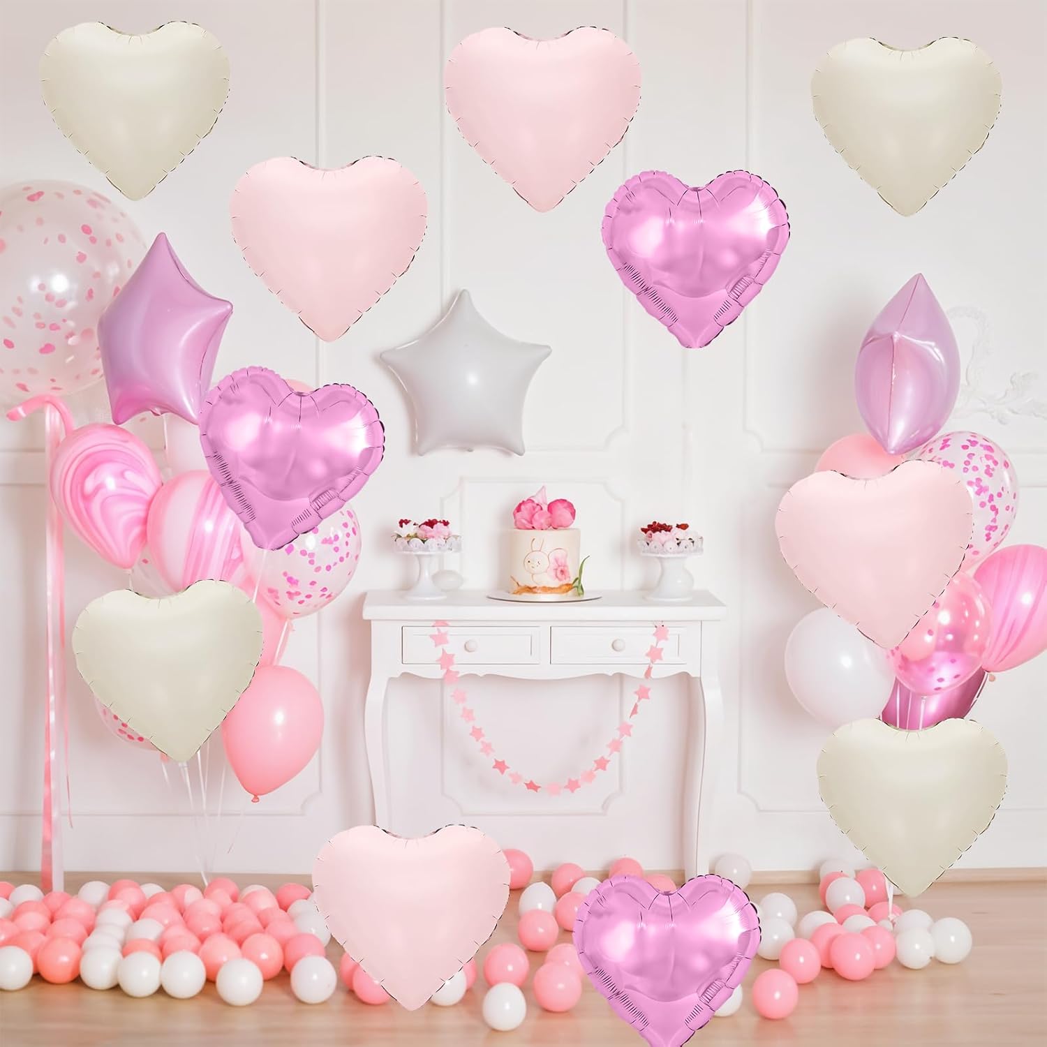 Pink Purple White Heart Balloons,12Pcs 18Inch Baby Pink Purple Cream White Heart Shaped Foil Helium Balloons for Baby Shower Birthday Anniversary Wedding Engagement Party Decorations