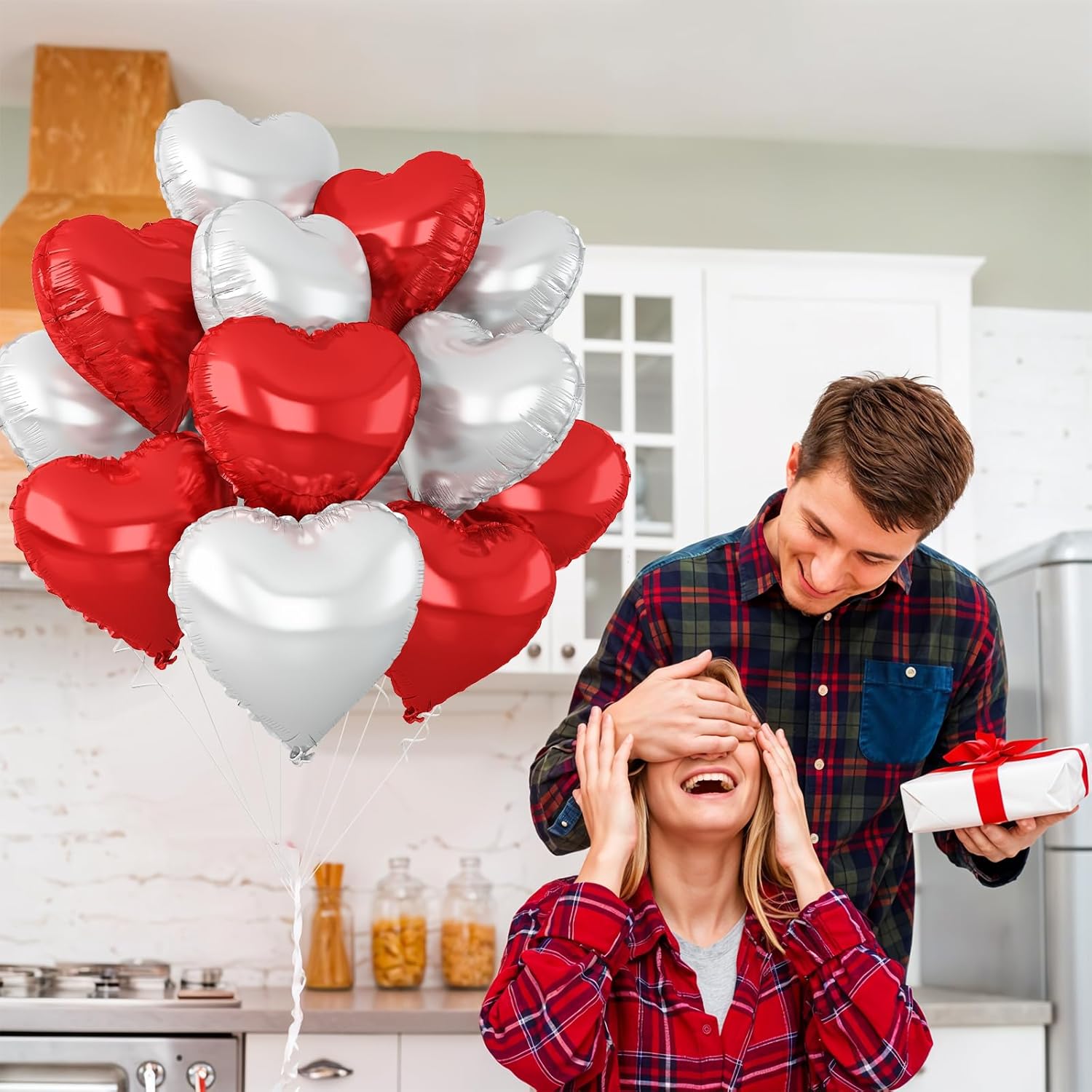 Red Silver Heart Balloons,12Pcs 18Inch Silver Red Heart Shaped Foil Helium Foil Balloons for Baby Shower Birthday Anniversary Wedding Engagement Party Decorations