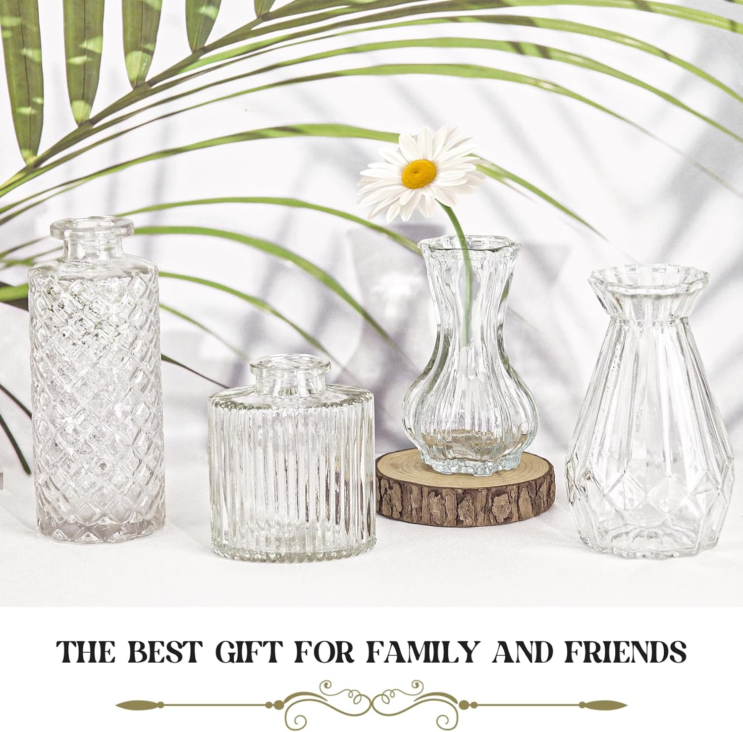 Set of 4 Glass Bud Vase Set, Small Vintage Clear Flower Vase Centerpieces for Table Bulk Cute Rustic Style Mini Vase for Home Decor Wedding Baby Shower Birthday Party