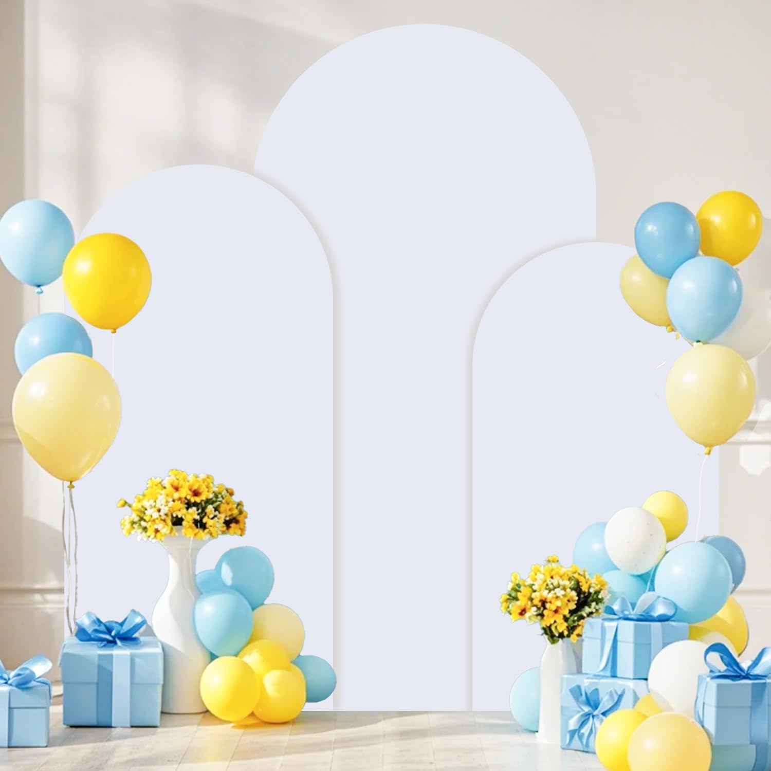 - đ§¸ăSize Information- Arch Stand and Cover SetăBackdrop Stand with Cover includes 3 gold metal arch backdrop stands and 3 white arch cover in sizes 7.2FT x 4FT(H x W), 6.6FT x 3.3FT(H x W) and 6FT x 2.6FT(H x W). The backdrop arch stand with cover is certain to meet your decoration needs and add a charming look to your celebrations.