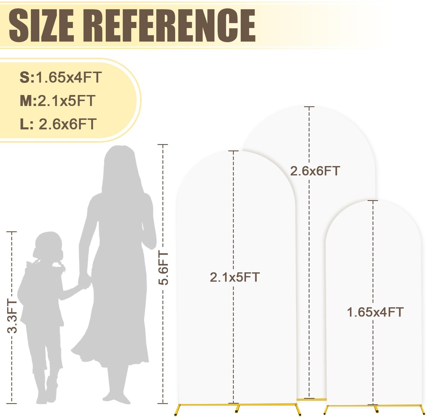 - ⭐Size Guide - Arch Backdrop Stand and Cover Set: The size of arch backdrop stand set about are 1.25FTx4FT(W x H), 2.1FTx5FT(W x H), 2.6FTx6FT(W x H) with white arch cover set. Metal arch backdrop stand set add a graceful and striking look for your party or event.