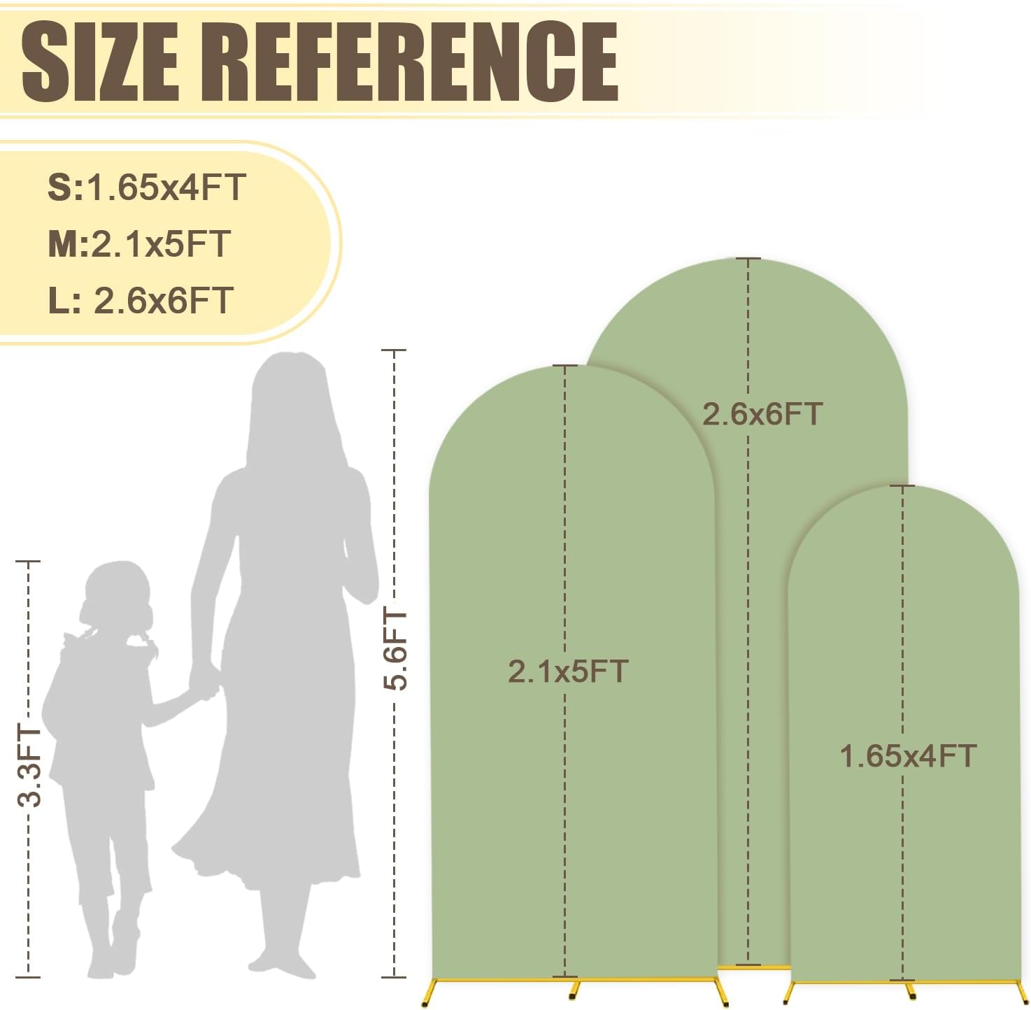 - ⭐Size Guide - Arch Backdrop Stand and Cover Set: The size of arch backdrop stand set about are 1.25FTx4FT(W x H), 2.1FTx5FT(W x H), 2.6FTx6FT(W x H) with sage green arch cover set. Metal arch backdrop stand set add a graceful and striking look for your party or event.