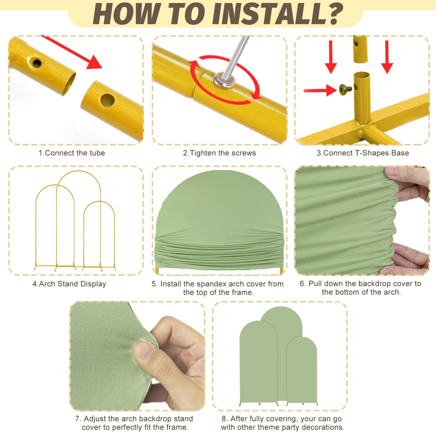 - ⭐Easy to Install - Arch Backdrop Stand: Each arch is cut into short sections, wedding arch stand can be easily assembled with wing screws in minutes and reuse for next event. Matching flower, arch cover and cylinder stand, backdrop arch stand create a truly stunning looking for your event.