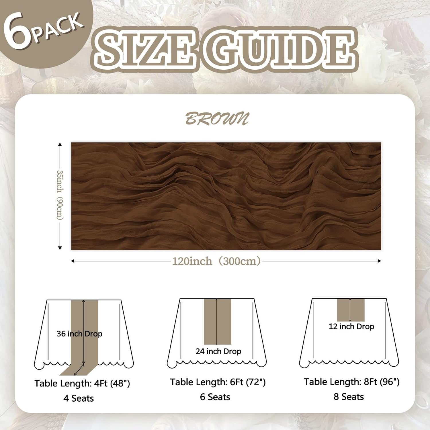 - 【Package Included】You Will Be Delighted To Receive 6 Packs Of Brown Table Runner. The Brown Cheesecloth Table Runner Quantity Is Abundant, Fully Meeting Your Daily Use And Various Event Needs. The Size Of The Table Runners Is 35 x 120 Inch, Which Can Perfectly Fit Tables Or Chairs In Various Event Scenarios. Besides, We Have Carefully Prepared A Wide Range Of Color Options For You, Which Are Highly Suitable For Creating A Romantic And Extraordinary Atmosphere.
