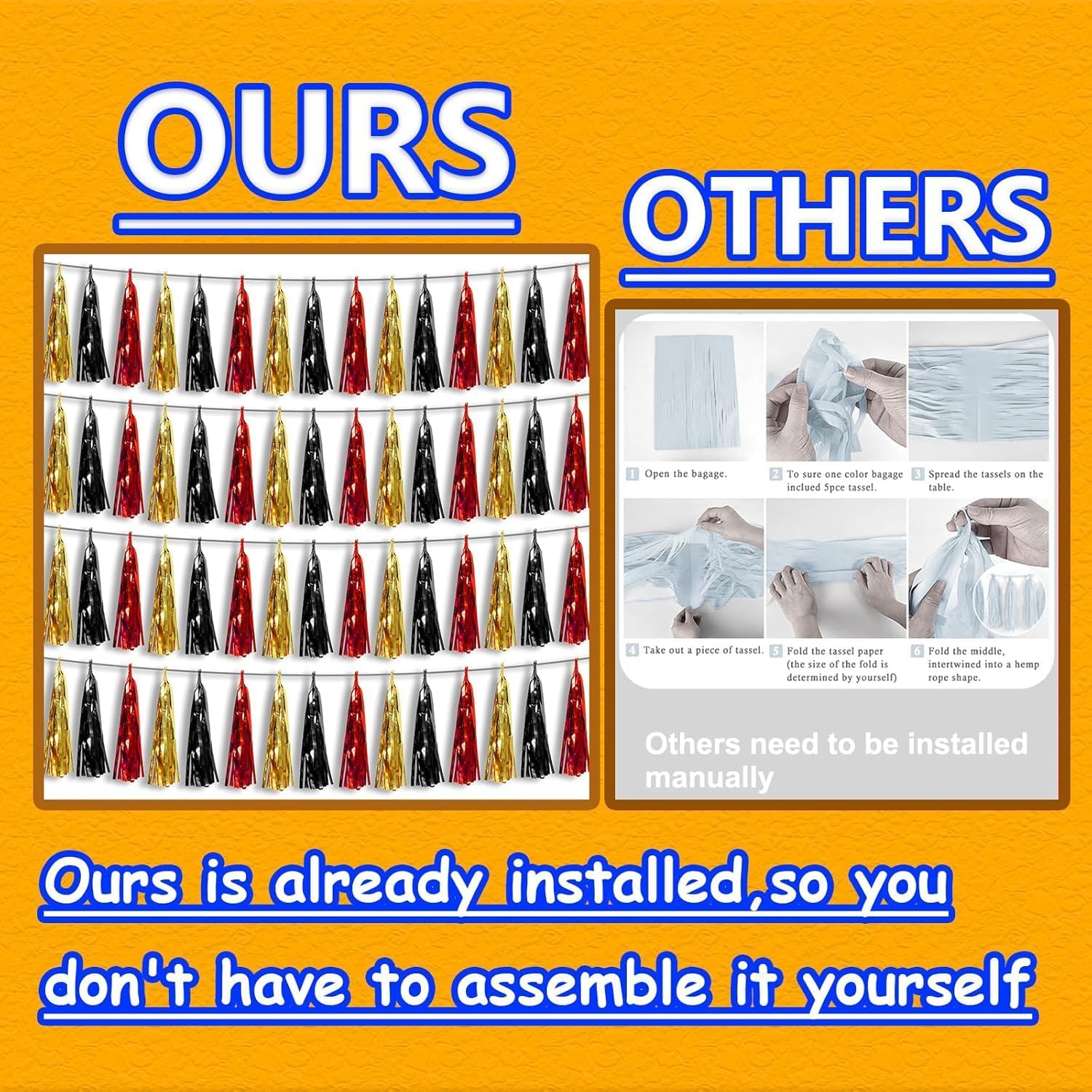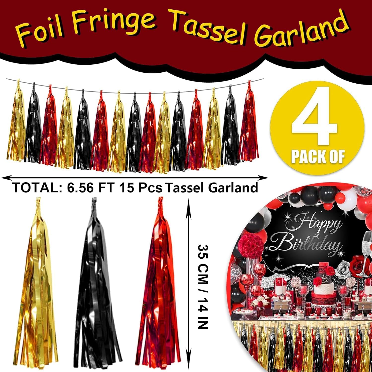 - 【Package Includes】The total length of the red black gold birthday tassels banner is 40 feet, divided into 4 strips, each 10 feet long. Each banner contains 15 tassels, and each tassel measures 14 inches, for birthday decorations many occasions uitable for Patriotic display, omecoming Float, Christmas Float, ecorative metal trailers, graduation floats etc