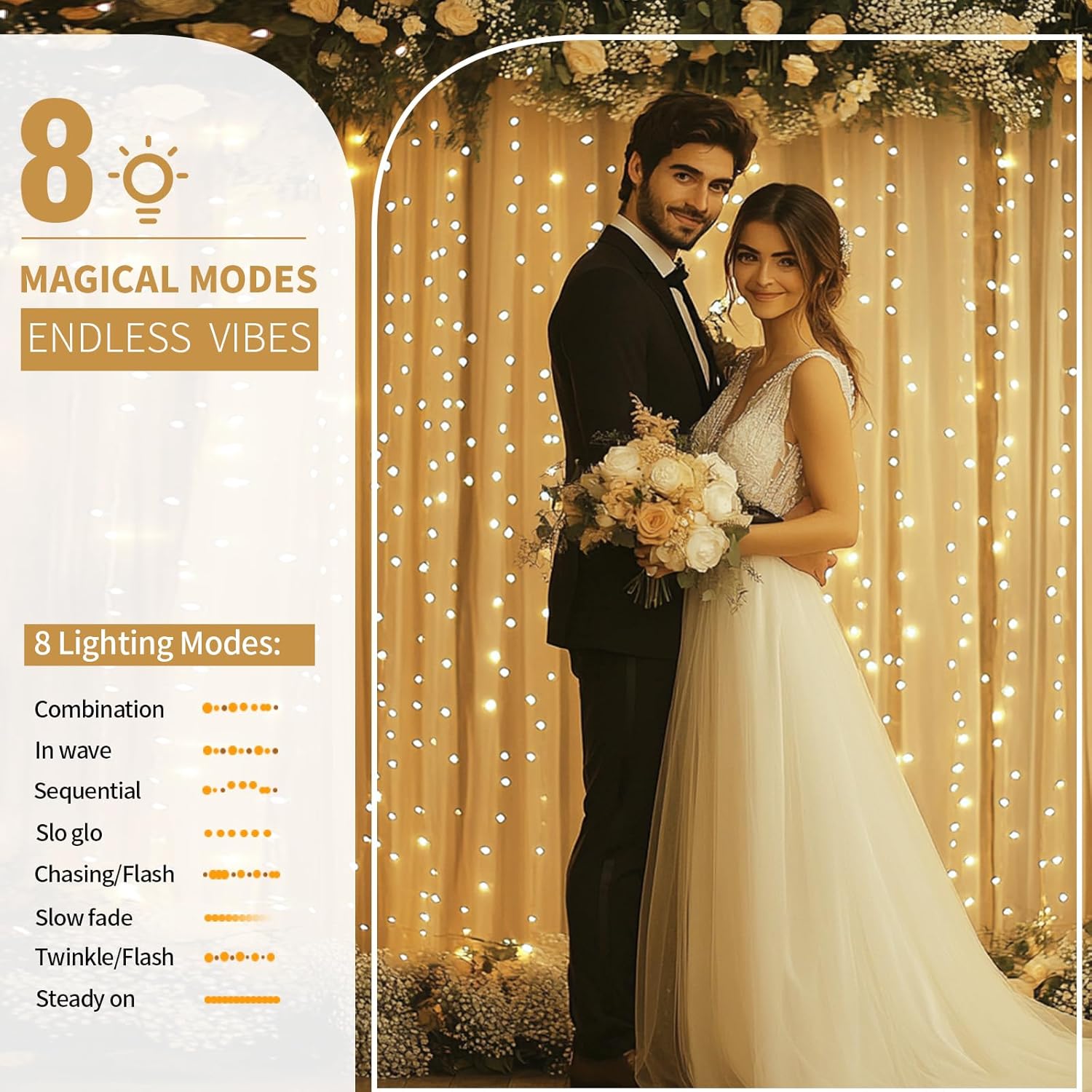 - All-Event Versatility: Perfect for creating magical backdrops at: Weddings (ceremonies, receptions, arches, bridal showers), Milestone Events (baby showers, birthdays, graduations), Photo Sessions (booths, portrait lighting), Seasonal Decor (Christmas windows, Halloween parties), Commercial Displays (stores, dessert tables, trade shows)