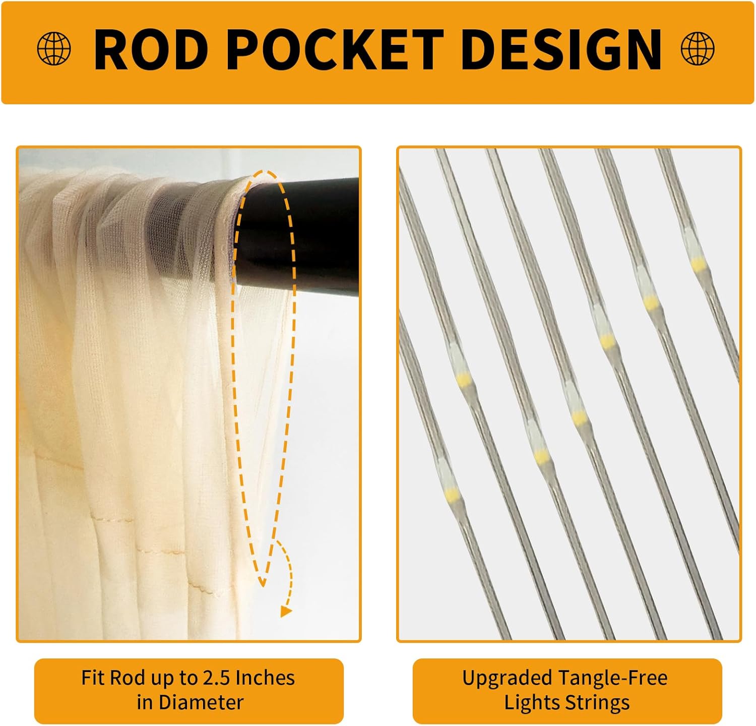 - Elegant Combination of Tulle Backdrop Curtains and Lights - Package Includes: 2 panels champagne sheer tulle backdrop curtains (5ft x10ft each, total 10x10ft).1 set of a 10x10ft warm white USB-powered tangle-free string lights (10 strands with 300 LEDs). 12 Transparent clips for hassle-free Installation. (Pro Tip: Buy multiple sets for fuller coverage and reduced sheerness!)