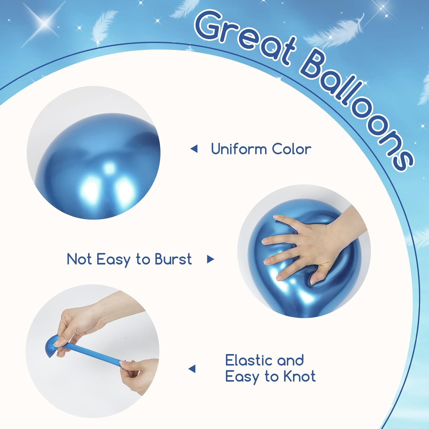 - Great Balloons: The blue balloons are made of great latex, which is thick and not easy to pop. They can be filled with air or helium, lasting a long time when properly inflated. To ensure the good experience, inflate quickly with a balloon pump and avoid overinflating to maintain their shape