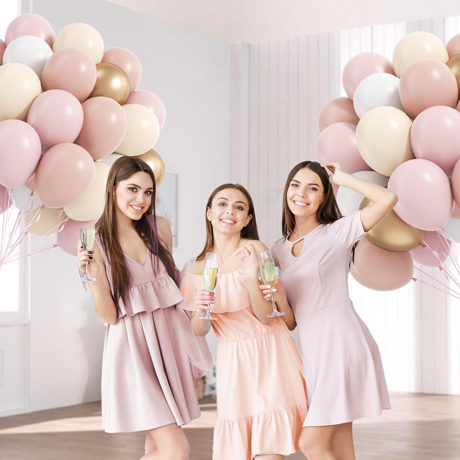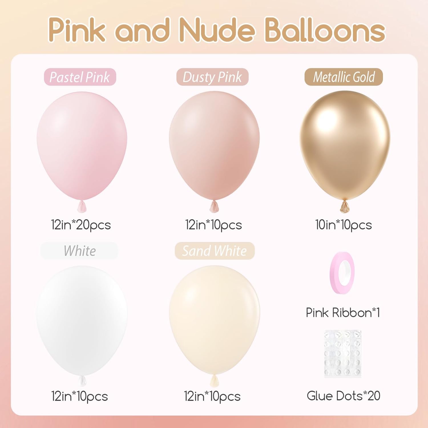 - What You Will Get: The package includes 12inch dusty pink balloonsx10, 12inch pastel pink balloonsx20, 12inch sand white balloonsx10, 12inch white balloonsx10, 10inch metallic gold balloonsx10, glue dotsx20, pink ribbonx1