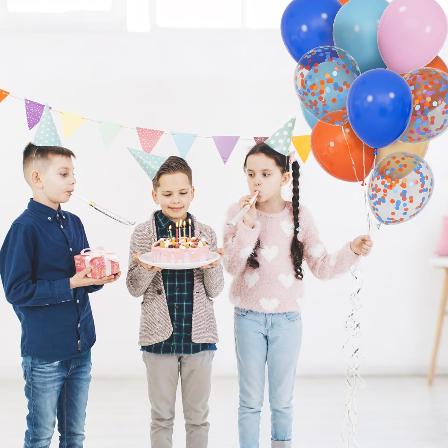 - Blue birthday decorations Package content: 68 pieces of 12 inch latex balloons (15 dark blue balloons, 15 light blue balloons, 15 skin color balloons, 15 orange balloons, 8 blue and orange mixed sequin balloons, 2 rolls of ribbon)