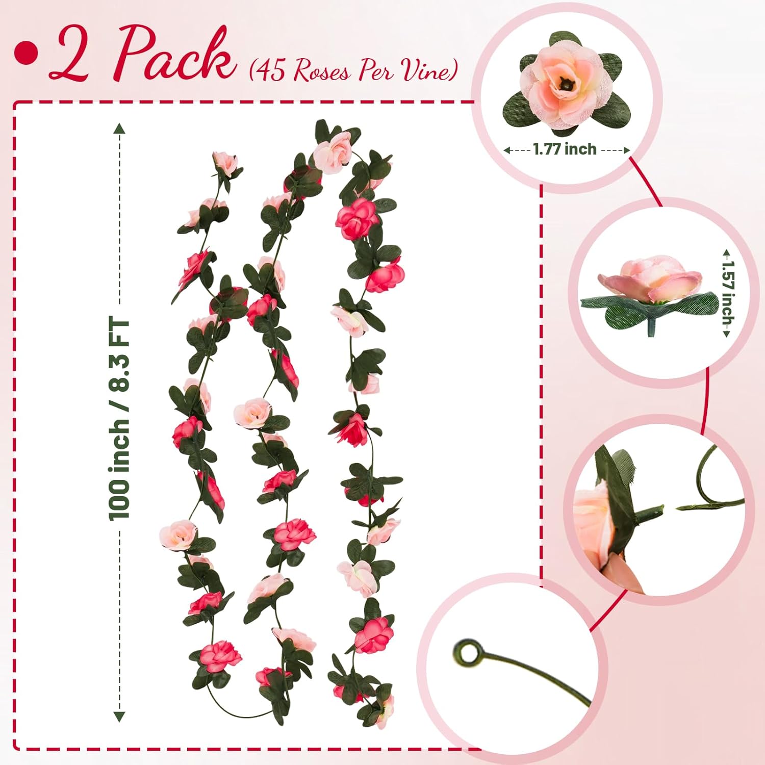 - Easy Installation & Versatile Use: Lightweight and flexible, our rose garland is easy to install. Each vine includes a hook design, making it simple to hang or bend to fit your needs. Perfect for decorating indoors or outdoors—on walls, windows, and garden arches—these versatile flower garlands enhance any setting.