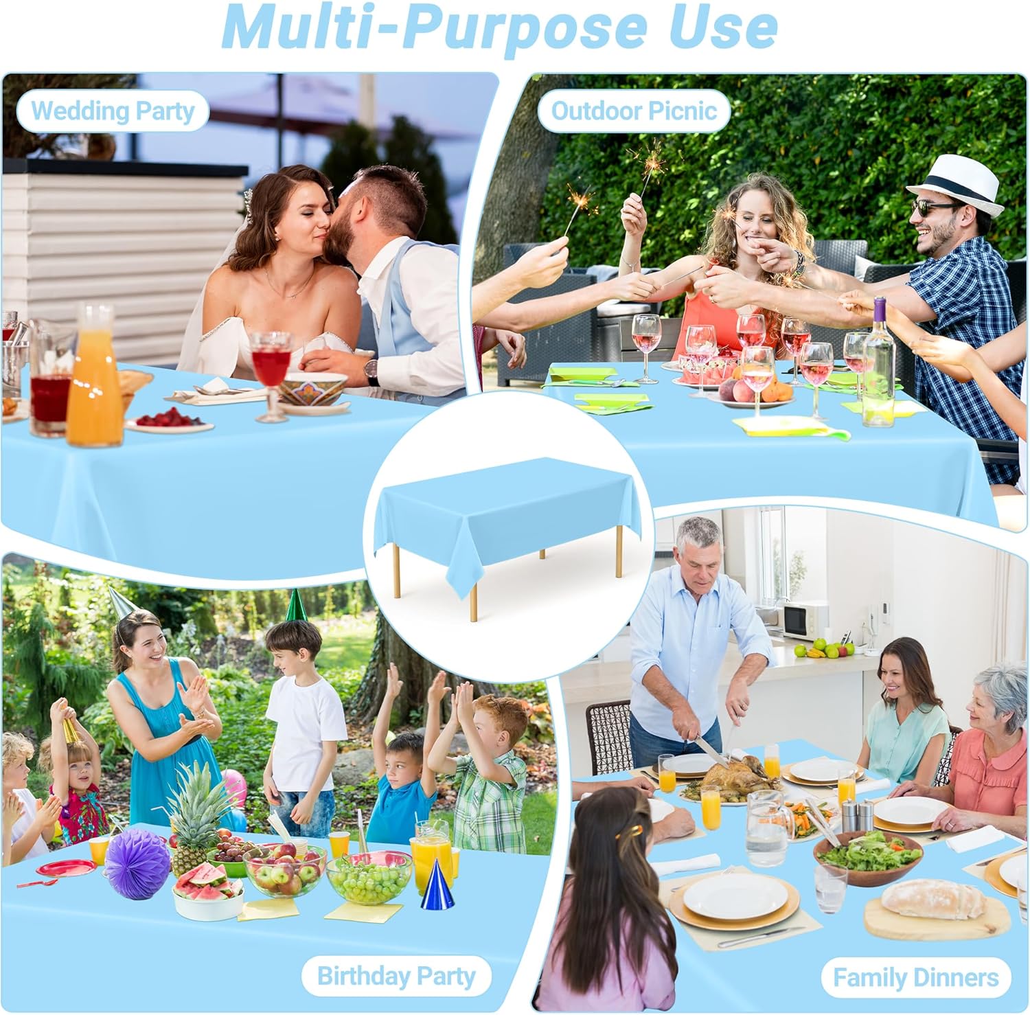 - Vibrant Utility: Versatile and practical, this table cloth for picnic table isn't just for tables—use it as a crafting surface, art project protector, or vibrant background for baby birthday decor. Its calming sky-blue plastic tablecloths bring a fresh, airy feel to weddings, holiday parties, birthday parties, and anniversary table decorations, effortlessly transitioning from laid-back gatherings to elegant affairs.