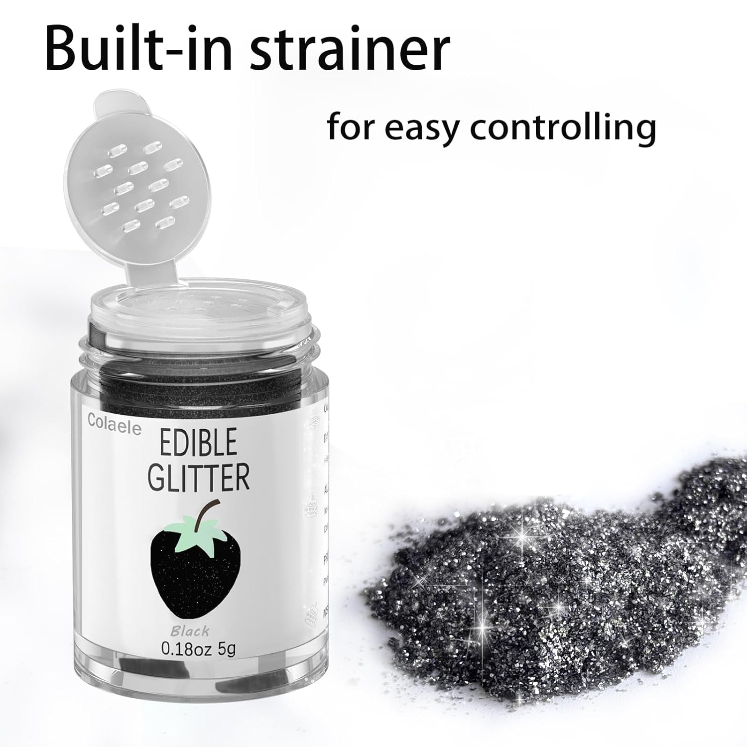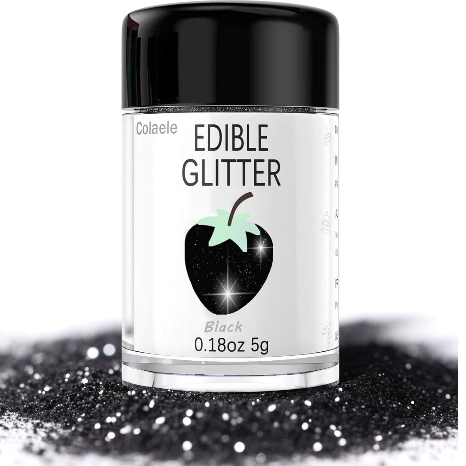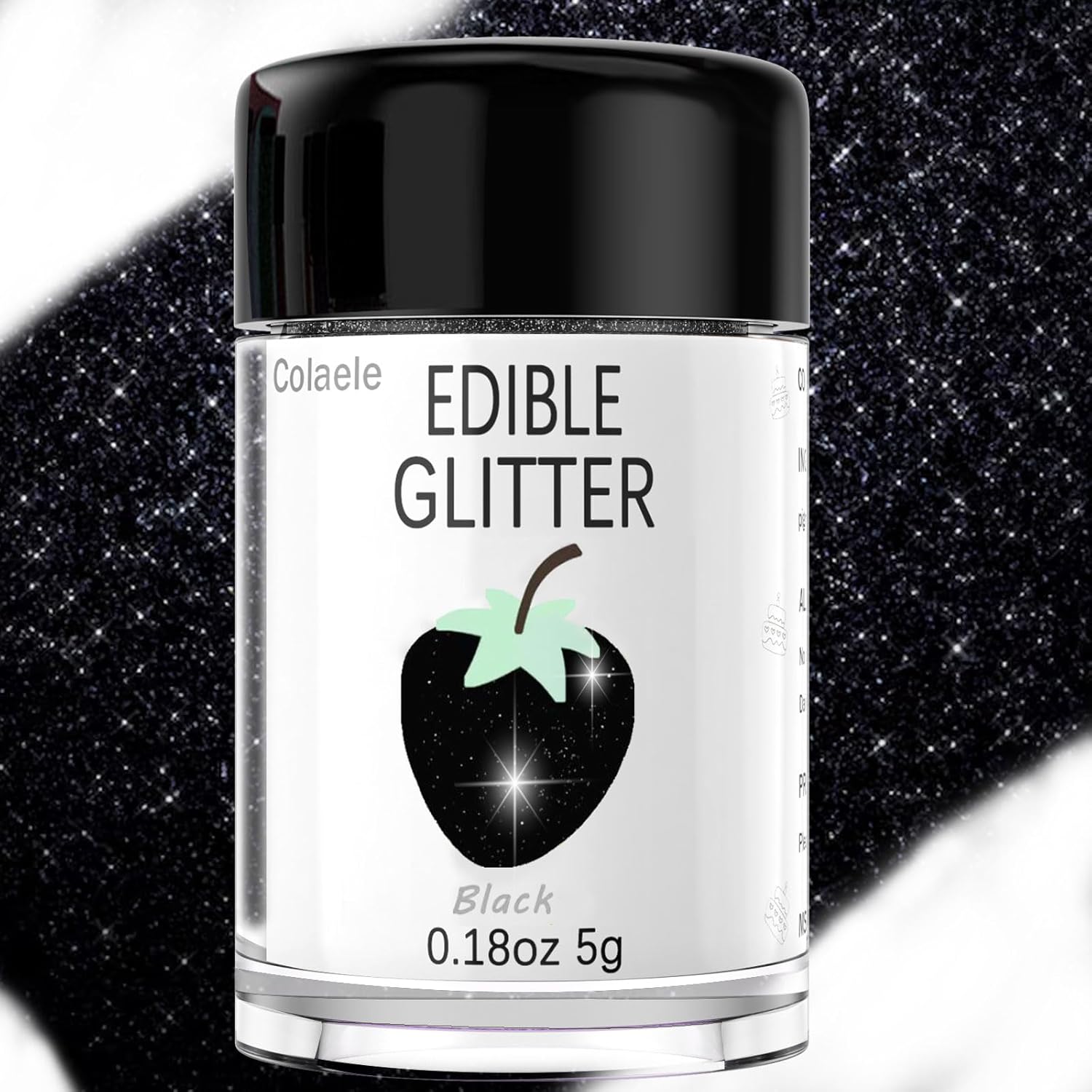 - Easy to Use: Colaele black edible glitter dust for strawberries is easy to use. Beginner friendly and all you need to do is sprinkle it on! Edible glitter also can be shared to decorations or used spray gun for smoothing. Sprinkle on Sparkle and Luster to Sweets for your cake or sugar art to add luxury luster effects