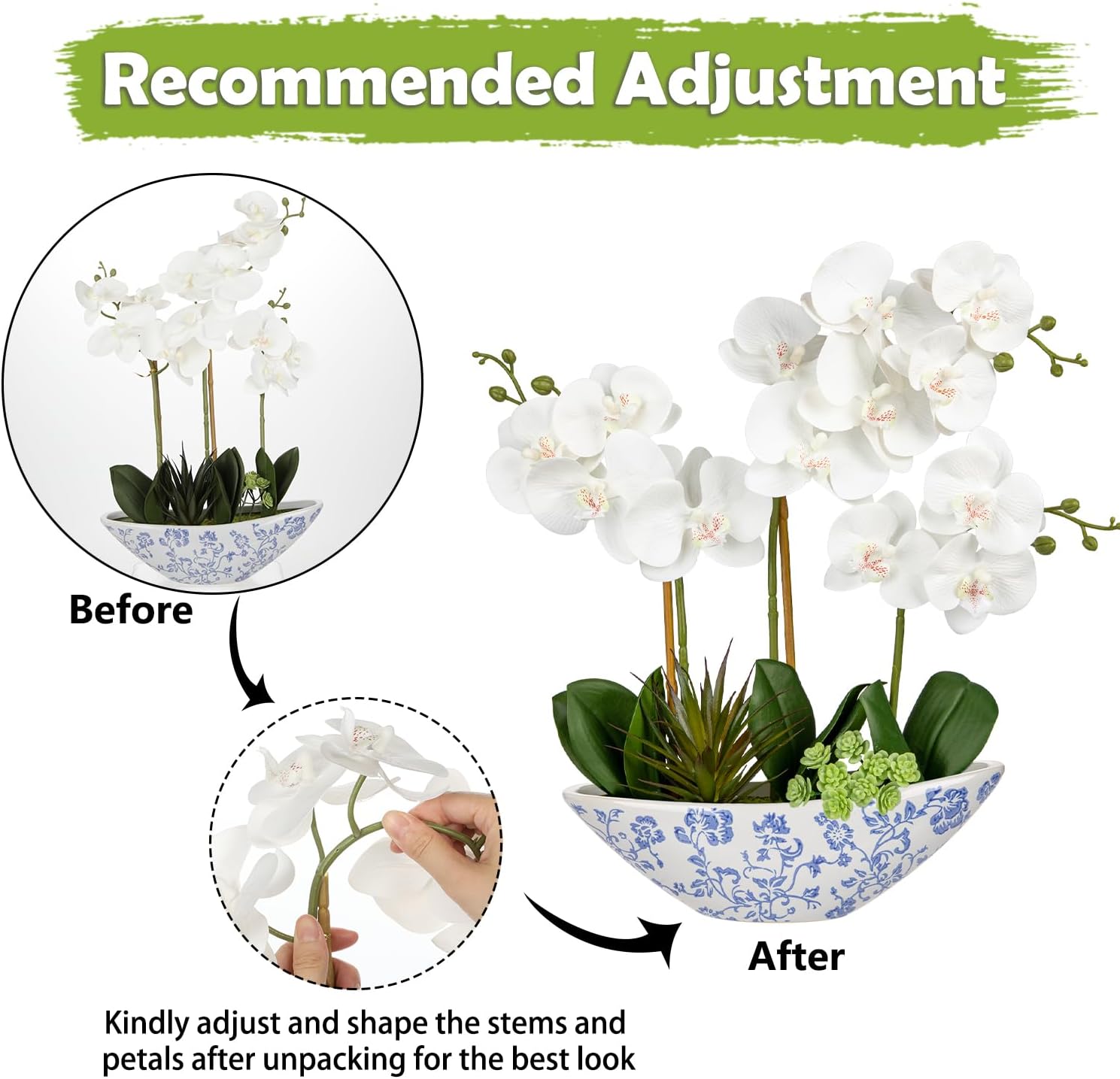 - Dimensions: Standing 17 inches high, the white orchid flower arrangement includes a ceramic boat-shaped blue and white floral pattern vase that measures 11 inches in diameter, making it an ideal size for various decor settings in both home and office environments. Note: Size shown reflects the arrangement after full expansion. Please allow a 1-2 cm error due to manual measurement.