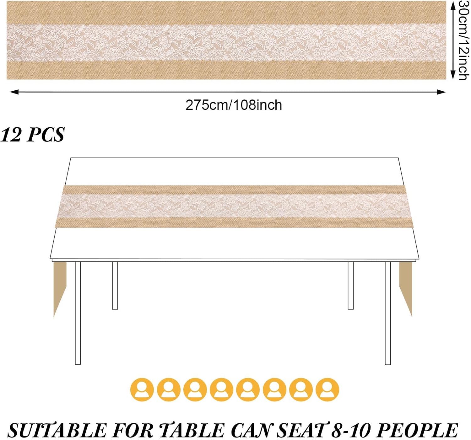 Xinnun 12 Pcs Burlap Table Runner with Lights 12 x 108 Inches Burlap Lace Table Runner Rustic Wedding Decorations Home Party (Flower)