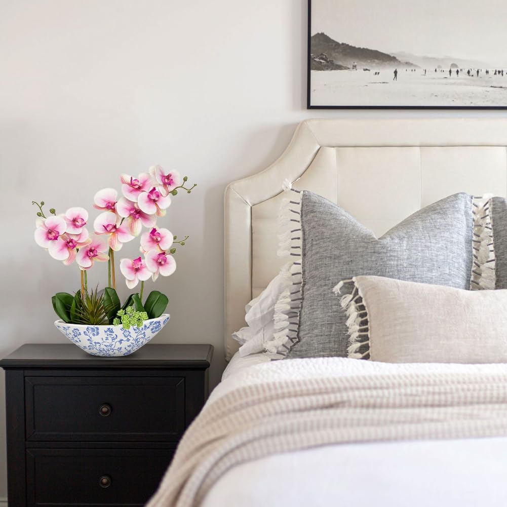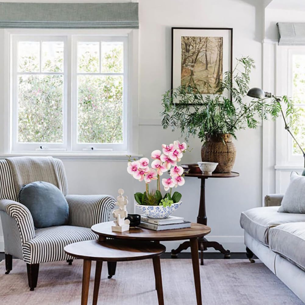 - Briful Orchid Fake Flowers 17in Pink Artificial Orchid Silk Flowers in Blue and White Pot Faux Orchid Arrangement for Home Office Bathroom Dining Table Modern Decoration