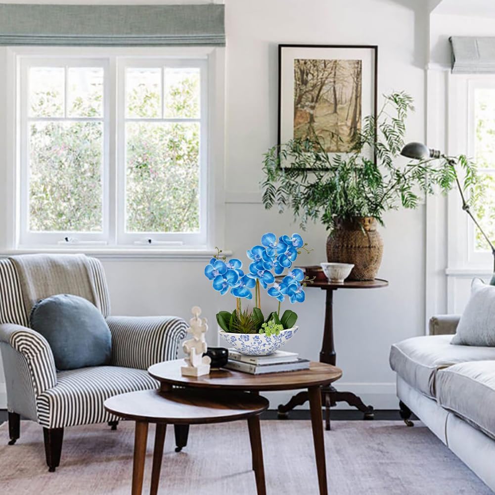 - Dimensions: Standing 17 inches high, the blue orchid flower arrangement includes a ceramic boat-shaped blue and white floral pattern vase that measures 11 inches in diameter, making it an ideal size for various decor settings in both home and office environments. Note: Size shown reflects the arrangement after full expansion. Please allow a 1-2 cm error due to manual measurement.
