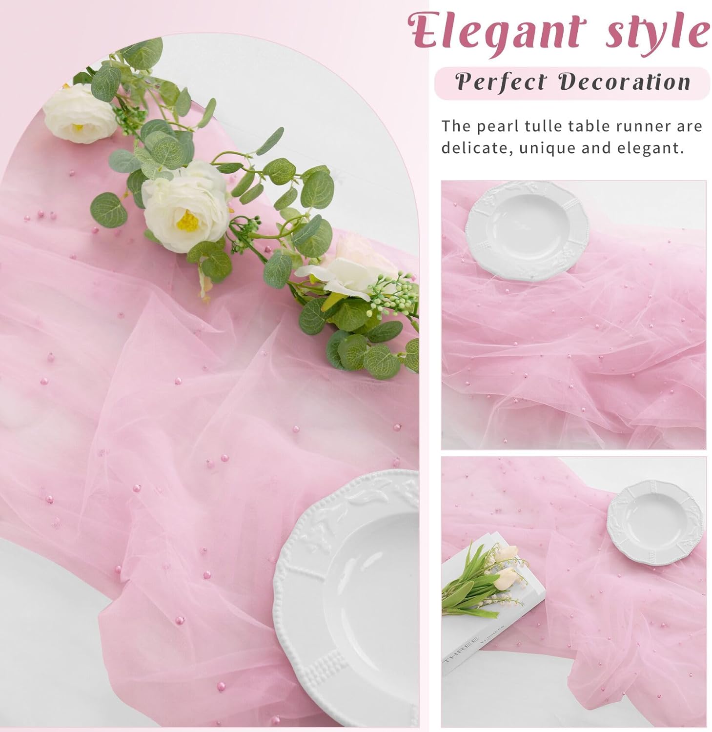 - 【Exquisite Workmanship】 These romantic table runners are made of premium tulle. Soft feeling, sheer, reusable, easy to clean and fade resistant. Delicate pearls embellished table runner works perfectly for many types of event decor, which will add a ton of elegance to any space.