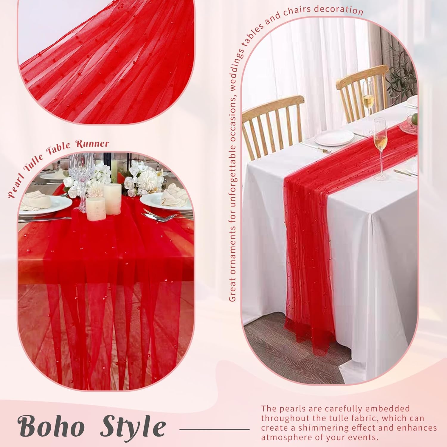 Set of 6 Pearl Table Runner 29 x 120 Inch Tulle Fabric Lace Table Runners Boho Rustic Tablecloth for Bridal Shower Birthday Party Wedding Arch Aisle Veil Dessert Table Decor(Red)
