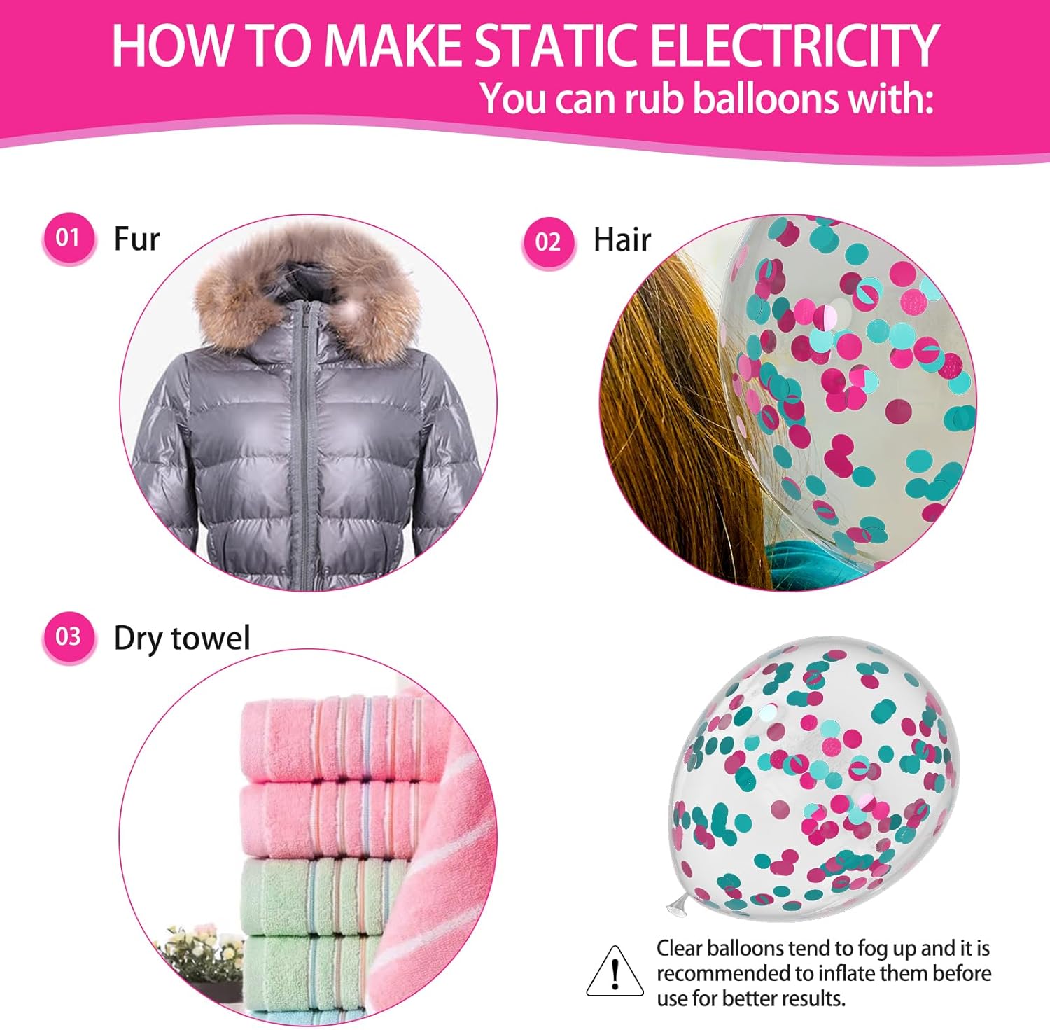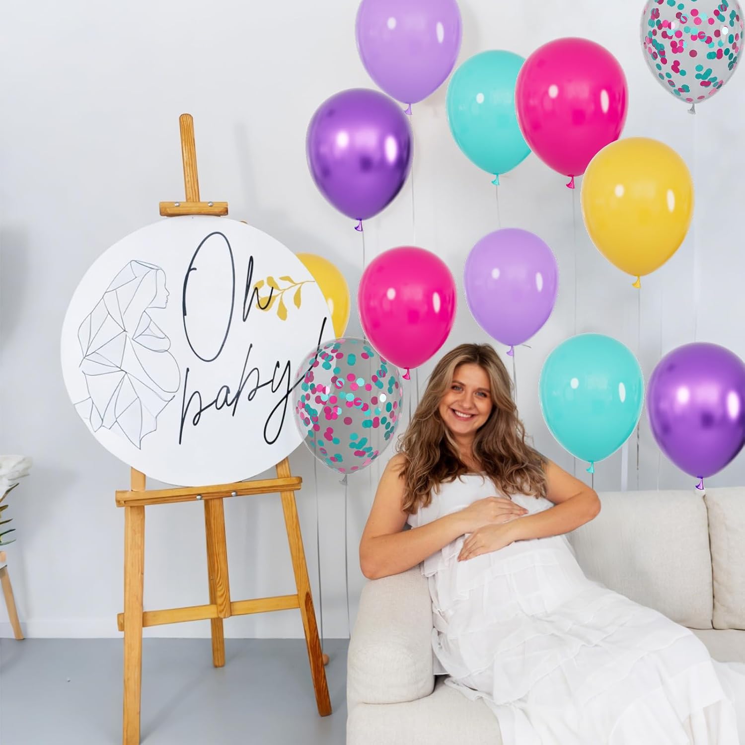 - Simple balloon pack: Contains 68 pieces of 12-inch latex balloons, including 8 metallic purple balloons, 8 hot pink teal mixed confetti balloons, 13 teal balloons, 13 purple balloons, 13 yellow latex balloons, and 13 hot pink balloons.