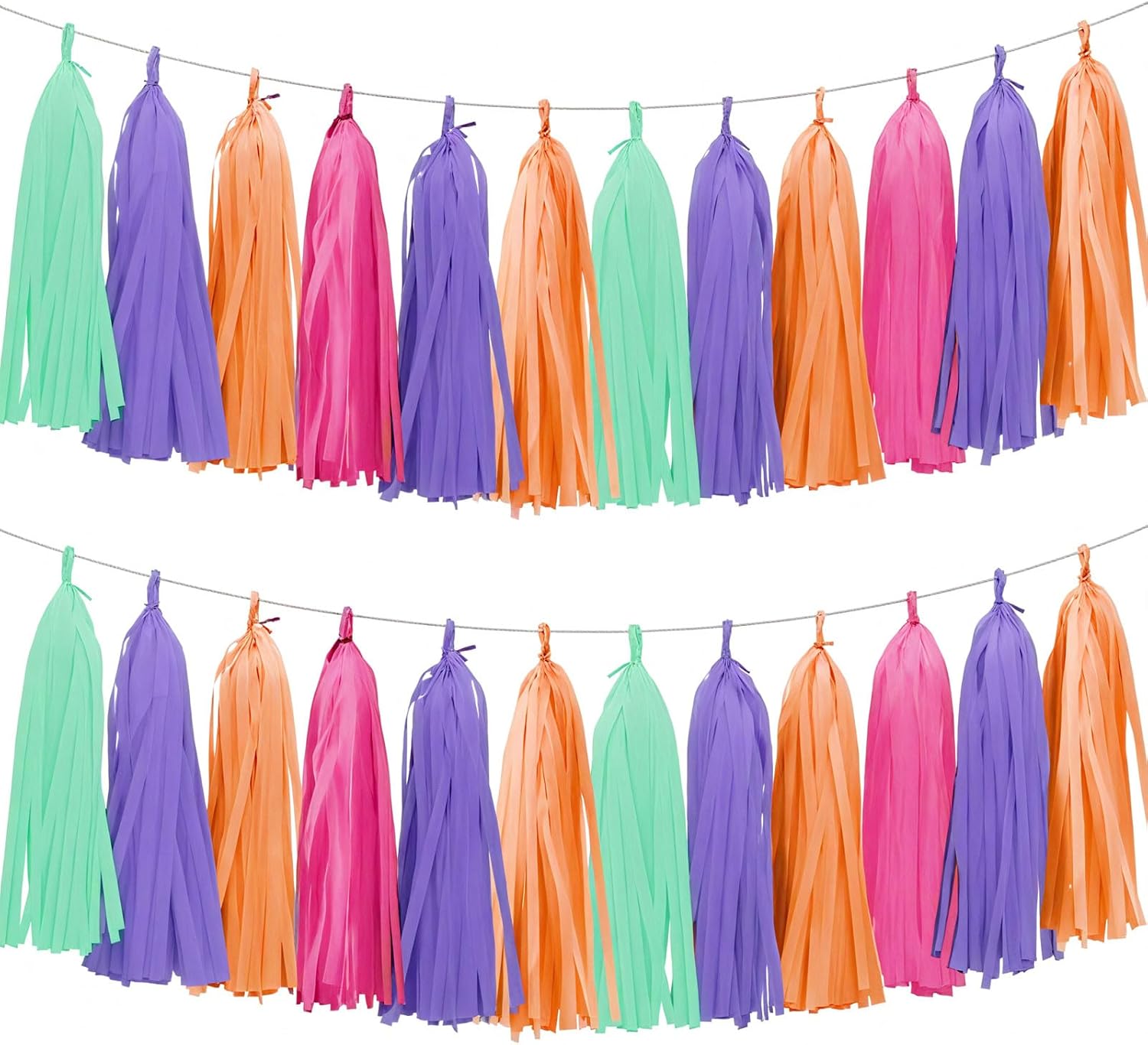 - PACKAGE CONTENTS: Set of 20 tissue paper tassels in purple, blue, orange pink colors, a 6-foot twine for easy hanging and instant decoration