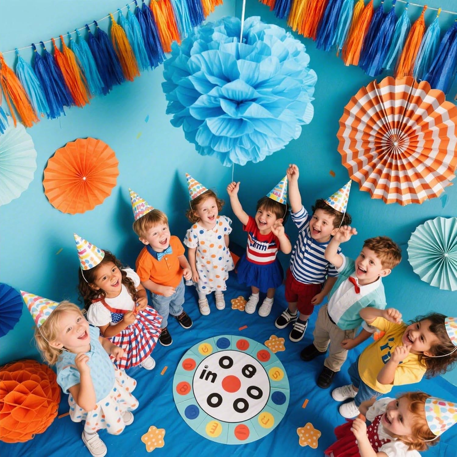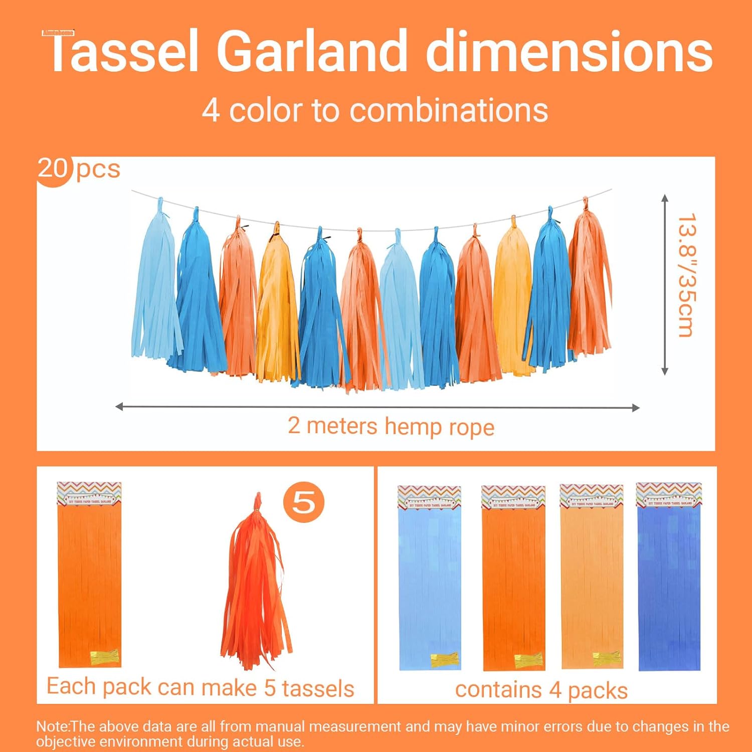 - PACKAGE CONTENTS: Set of 20 tissue paper tassels in navy ,light orange,orange red, blue, a 6-foot twine for easy hanging and instant decoration