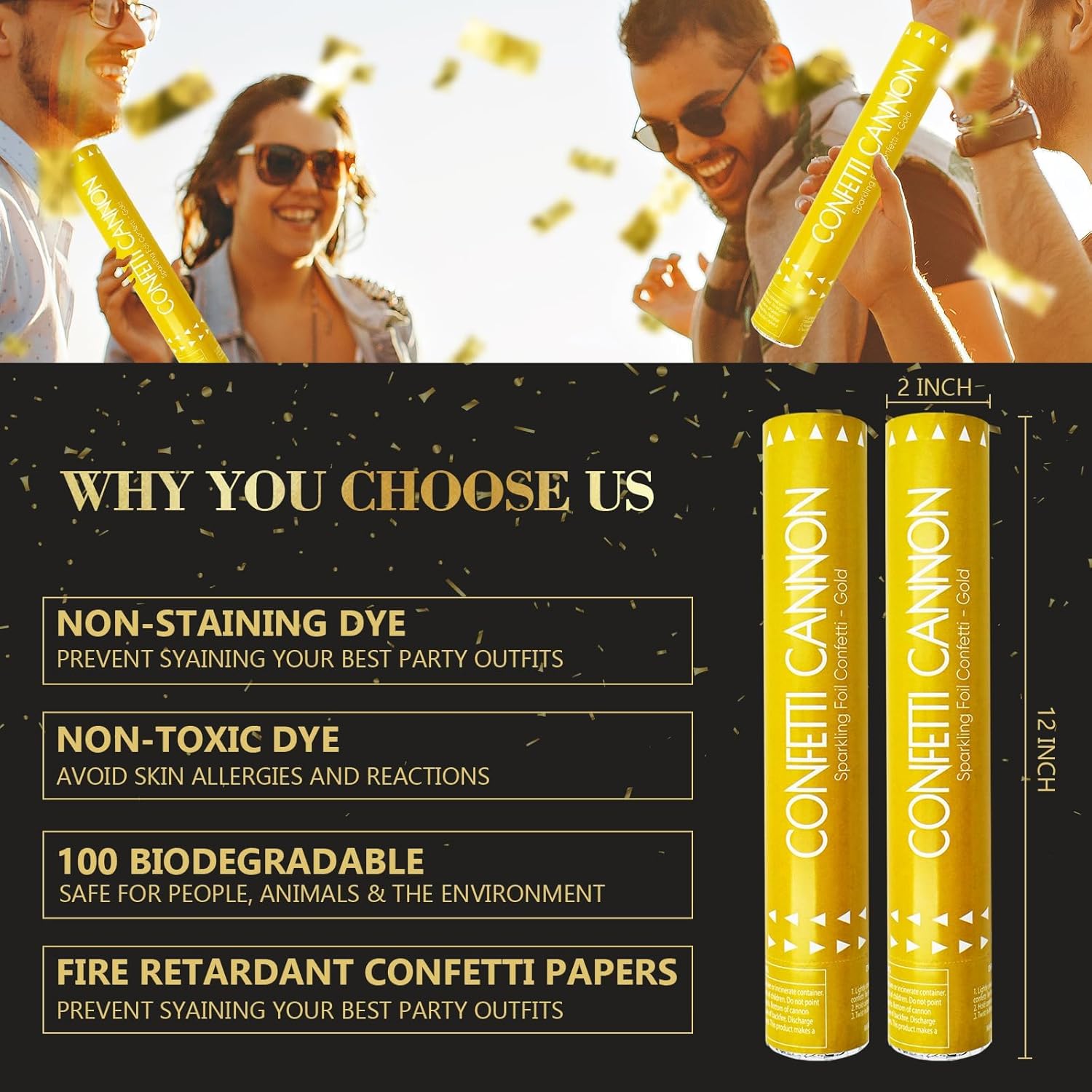 - ETERNAL MEMORIES - 12 pack gold confetti party poppers confetti shooters work well indoors and outdoors.After twisting the air compression canister at the bottom, the party poppers makes a wonderful explosion.Gold confetti cannon are great for adding fun, festive energy to any party or gathering. These confetti cannons bulk are perfect for any special event and any other holiday