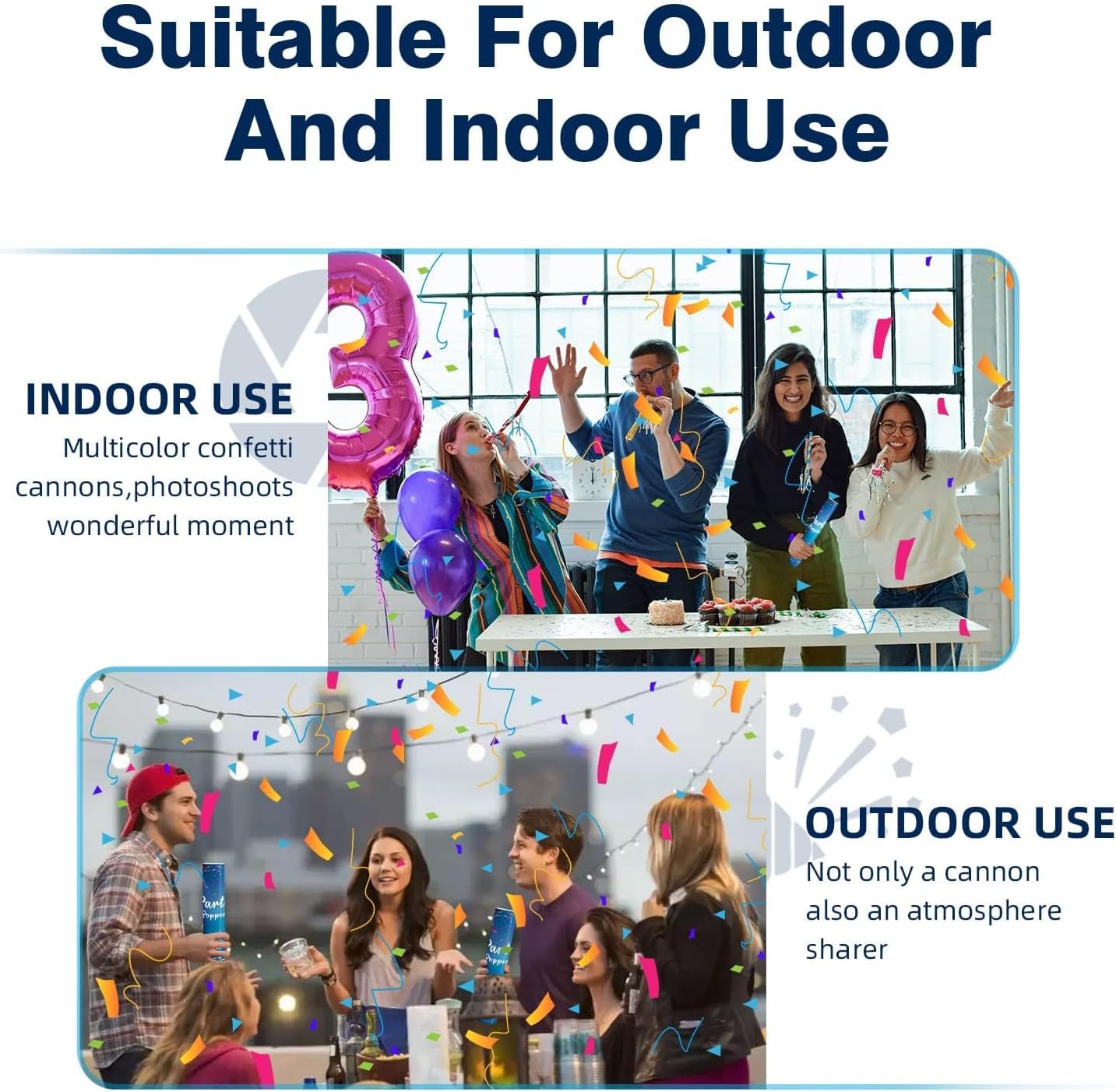 - SAFE AND EASY TO USE - Simply aim confetti poppers upwards,gently rotate the bottom of the confetti cannon party poppers,the confetti cannon with a wonderful explosion,accompanied by screams and cheers,slowly falling confetti creates a very wonderful visual effect after launch