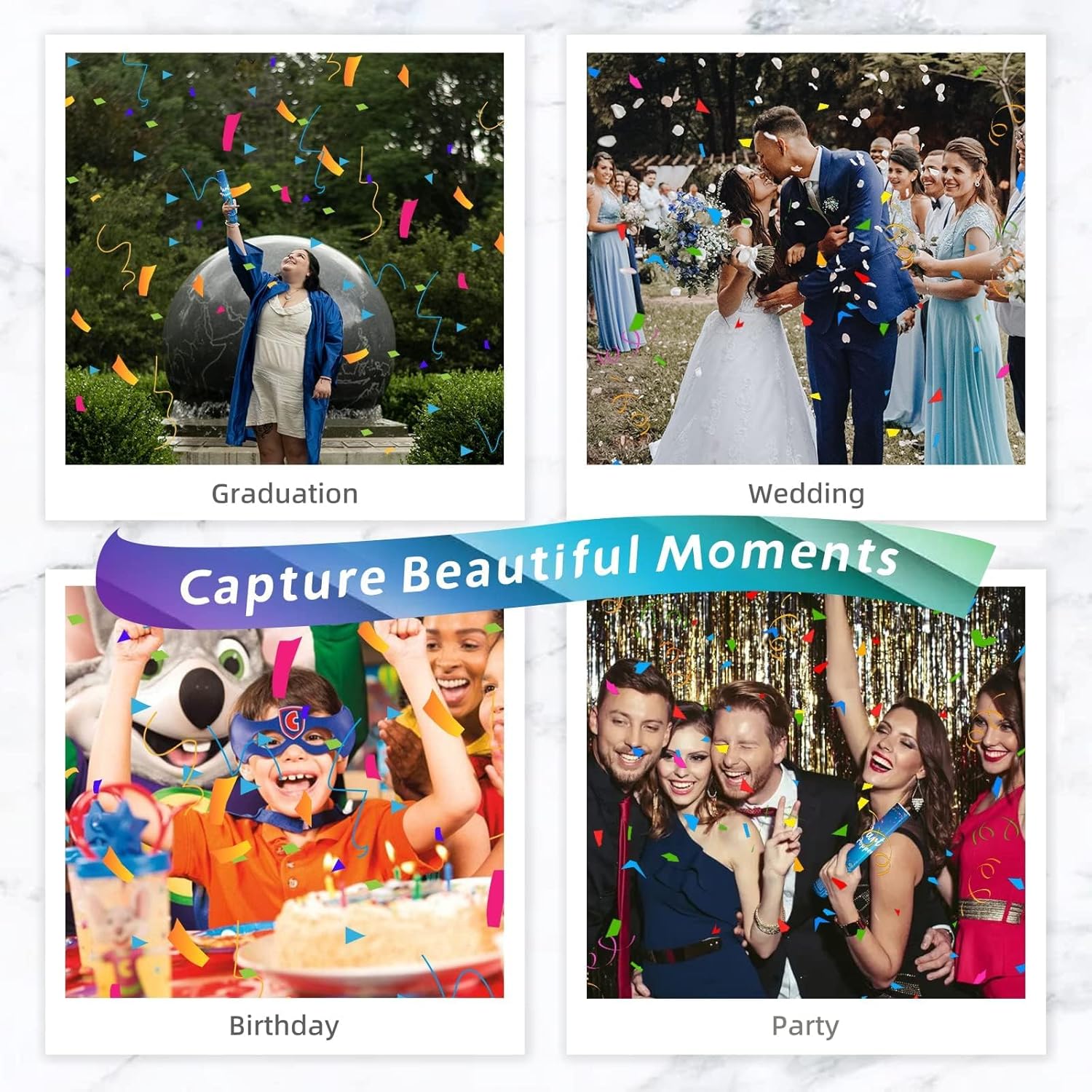 - CONFETTI POPPERS,PERFECT FOR ANY EVENT - Confetti cannon biodegradable suitable for Graduation,Wedding Celebration,Birthday, Christmas Eve and New Year Celebration or other celebrations.At every wonderful moment,our confetti cannon are a good atmosphere,the biodegradable multicolor confetti poppers sprayed in the air will create a visual feast
