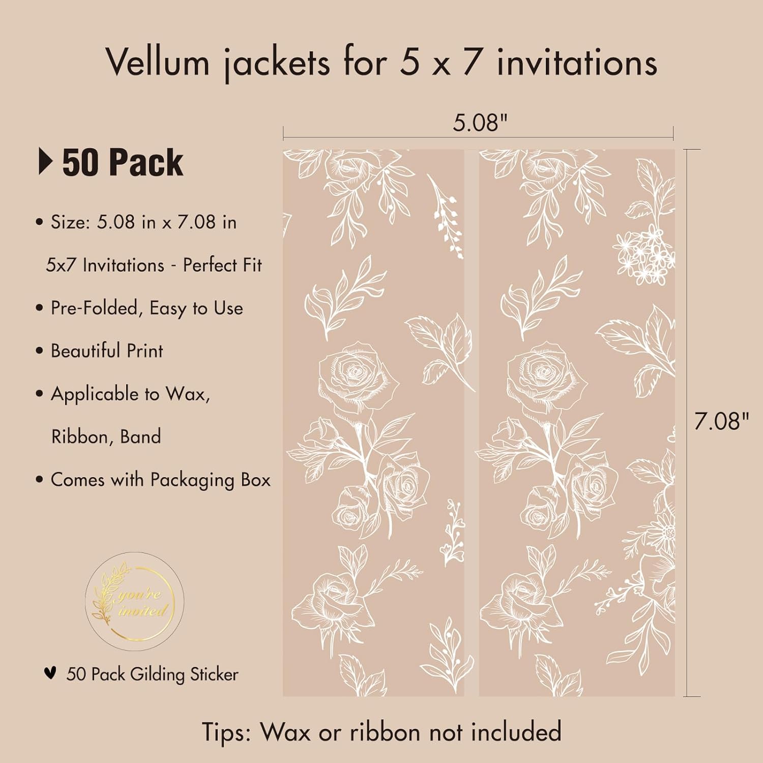50 Pack Pre-Folded Vellum Jackets for 5x7 Invitations,AZAZA Translucent Invitation Sleeves,115GSM Vellum Jackets 5x7, Wedding Invitation Accessories,for Weddings Birthdays,Botanical Flower Pattern