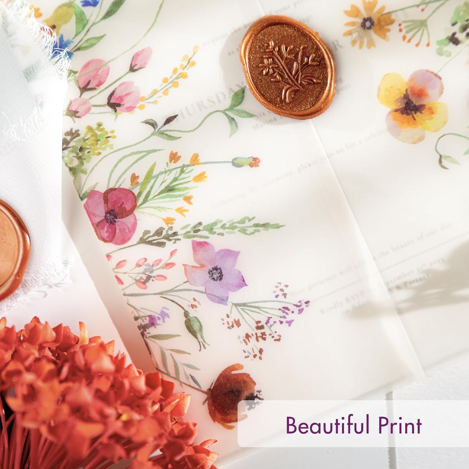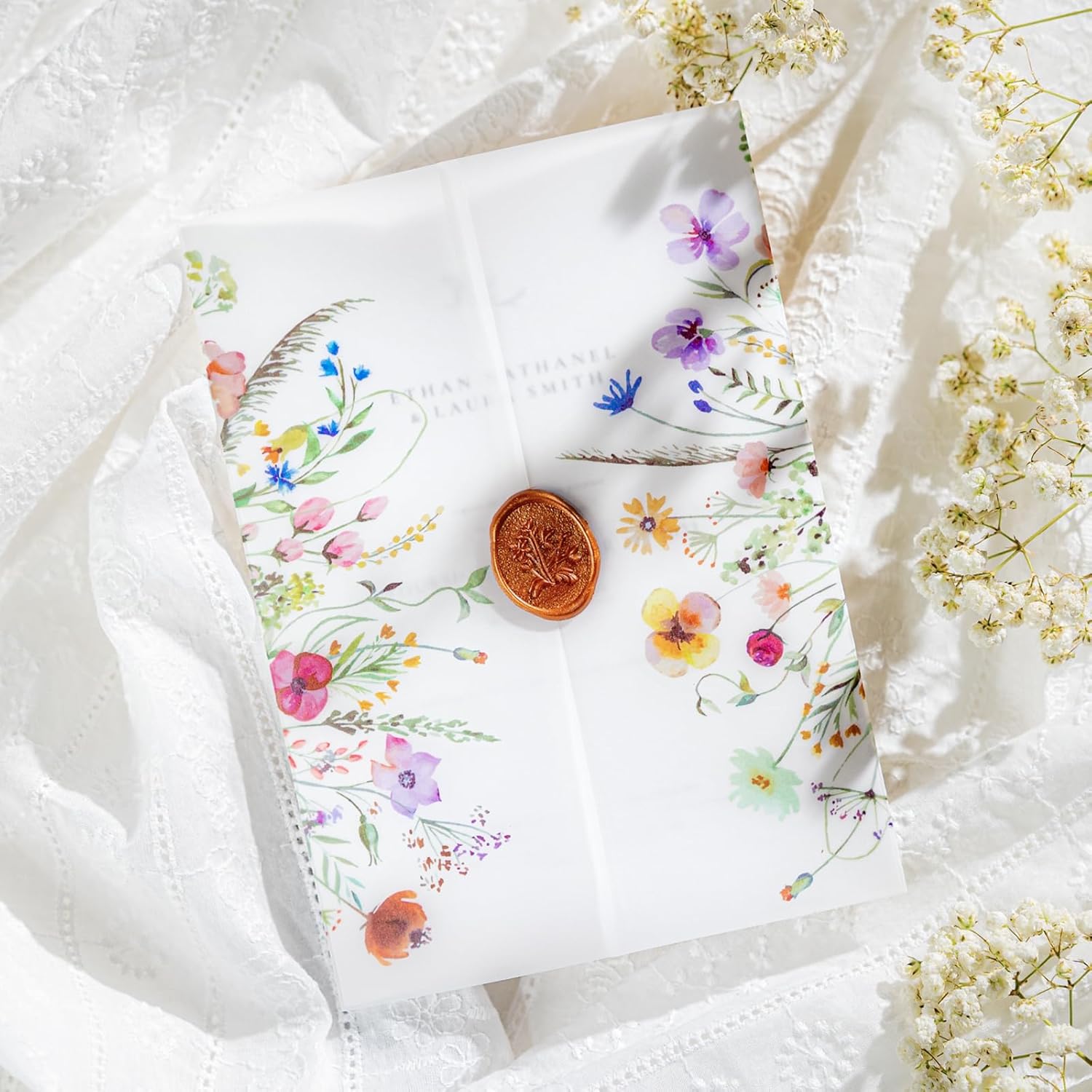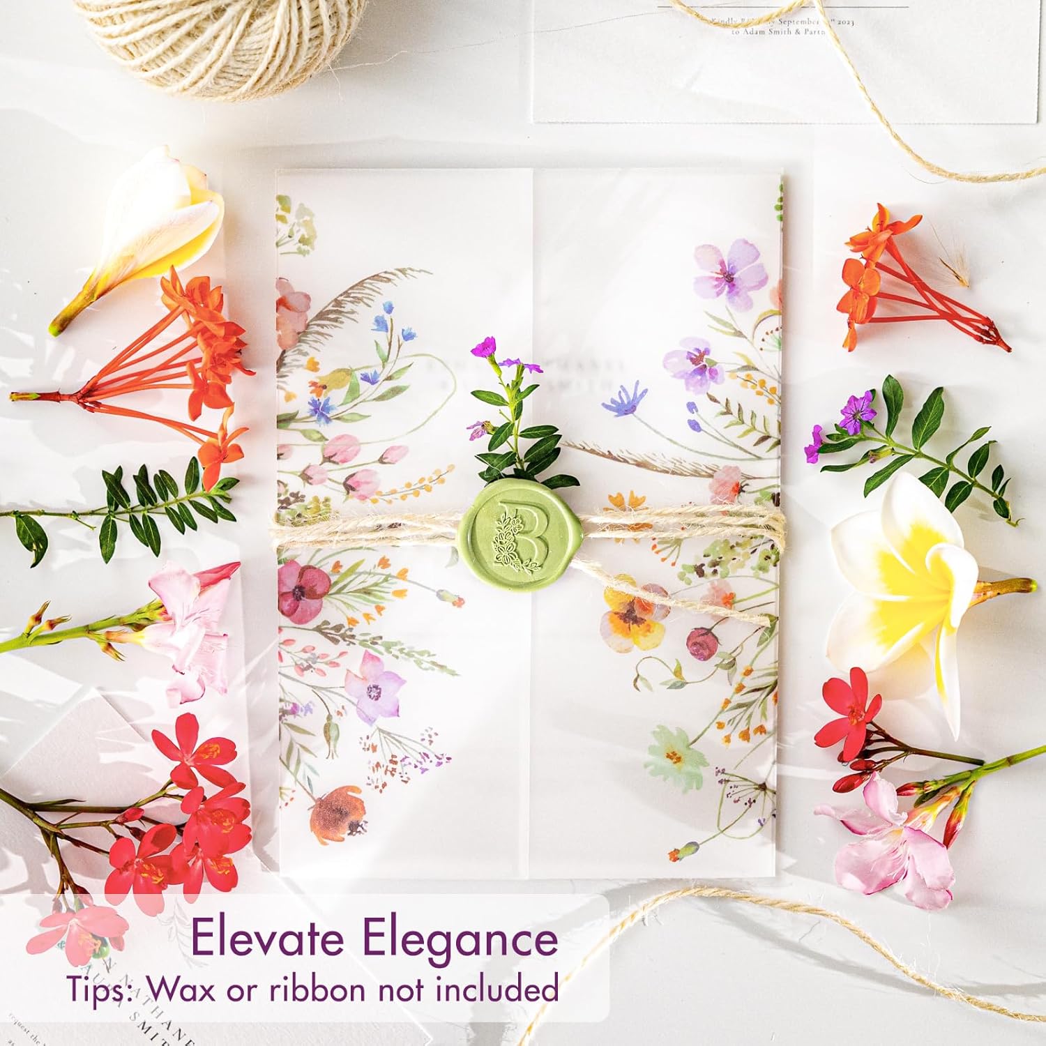 50 Pack Pre-Folded Vellum Jackets for 5x7 Invitations,AZAZA Pretty Translucent Invitation Sleeves,115GSM Vellum Jackets 5x7, Wedding Invitation Accessories,for Weddings Birthdays,Wildflowers