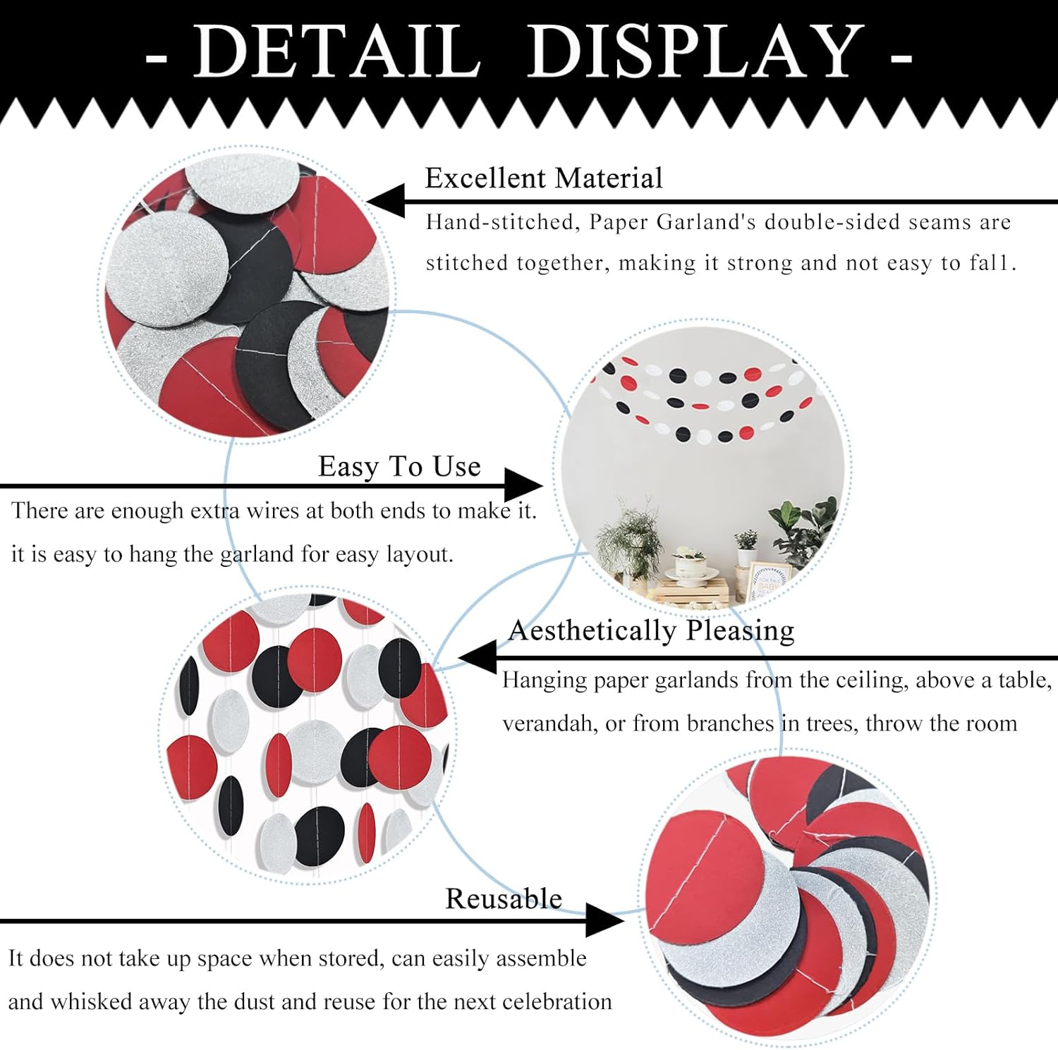 MerryNine Paper Garland 5 Pack, 50ft Glitter Paper Garland Circle Dots Hanging Decor, Banner for Baby Shower, Birthday, Nursery Party Decor (Red Black Silver)