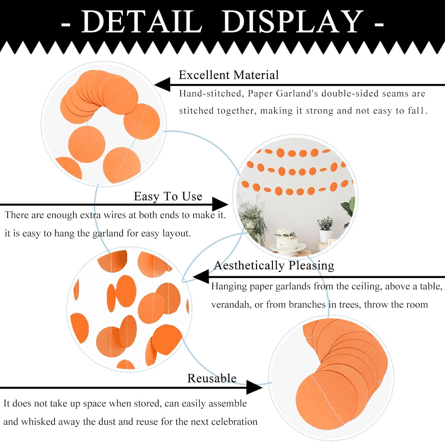 - How It'S Made: MerryNine Paper Garland is made of high quality card stock circle polka dots that is sewn together with double sturdy thread, each thread is sewn with 40pcs dots, each end has plenty of extra thread to makes it easy to hang the garland