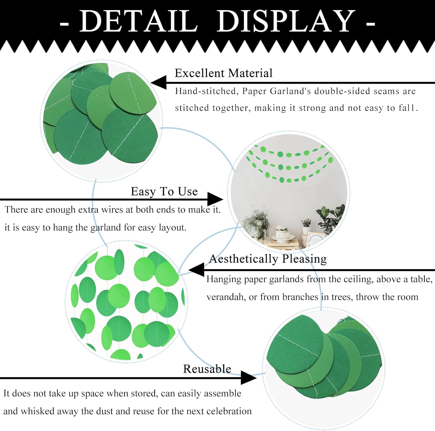 - Pakage - MerryNine Paper Garland Circle Polka Dots Set comes with 5pack, each paper garland is 10 Feet (Total 50 Feet) and each circle dot is approximately 2 inch in diameter