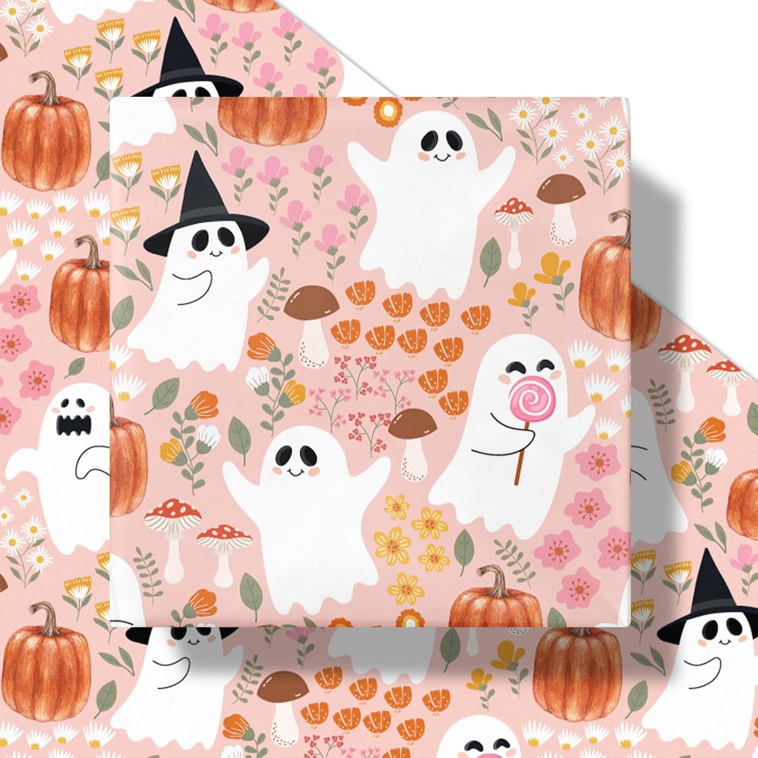 LeZakaa Pink Halloween Wrapping Paper Roll, Cute Ghosts Pumpkins Fall Florals in Pink Spooky Design Trick-or-Treat Gift Wrap for Girls, Kids, Soft Aesthetic Halloween Gifts, Mini Roll 17 in x 16.4 Ft