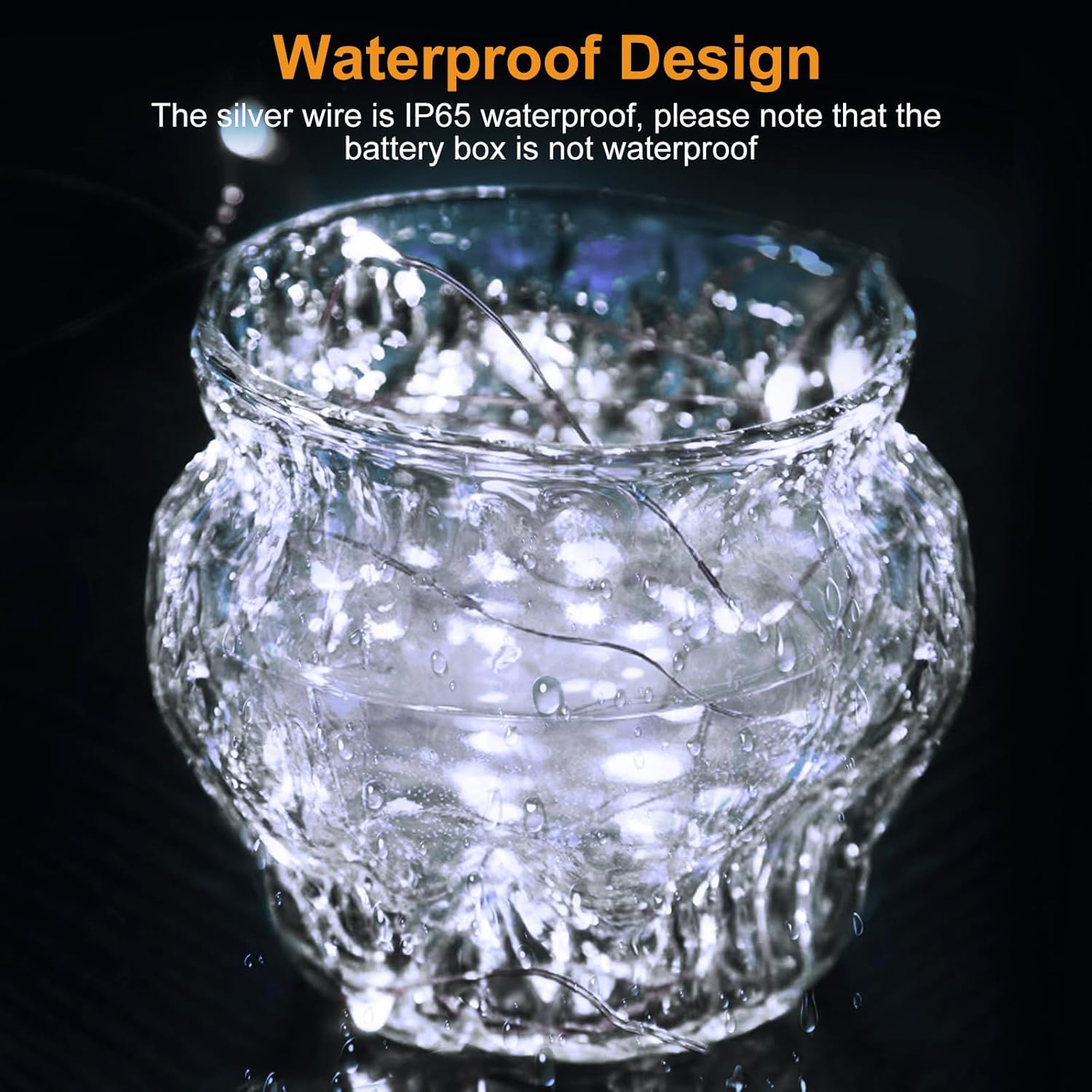 - IP65 Waterproof and Safe to Use: The light wire supports IP65 waterproof, making it easily withstand humid environments, and the string light strands is even submersible in water (Note: Battery box is not waterproof). Powered by a safe 1.5V low voltage, and will not heat or short-circuit even after a long use, guaranteeing the safety of touch and use