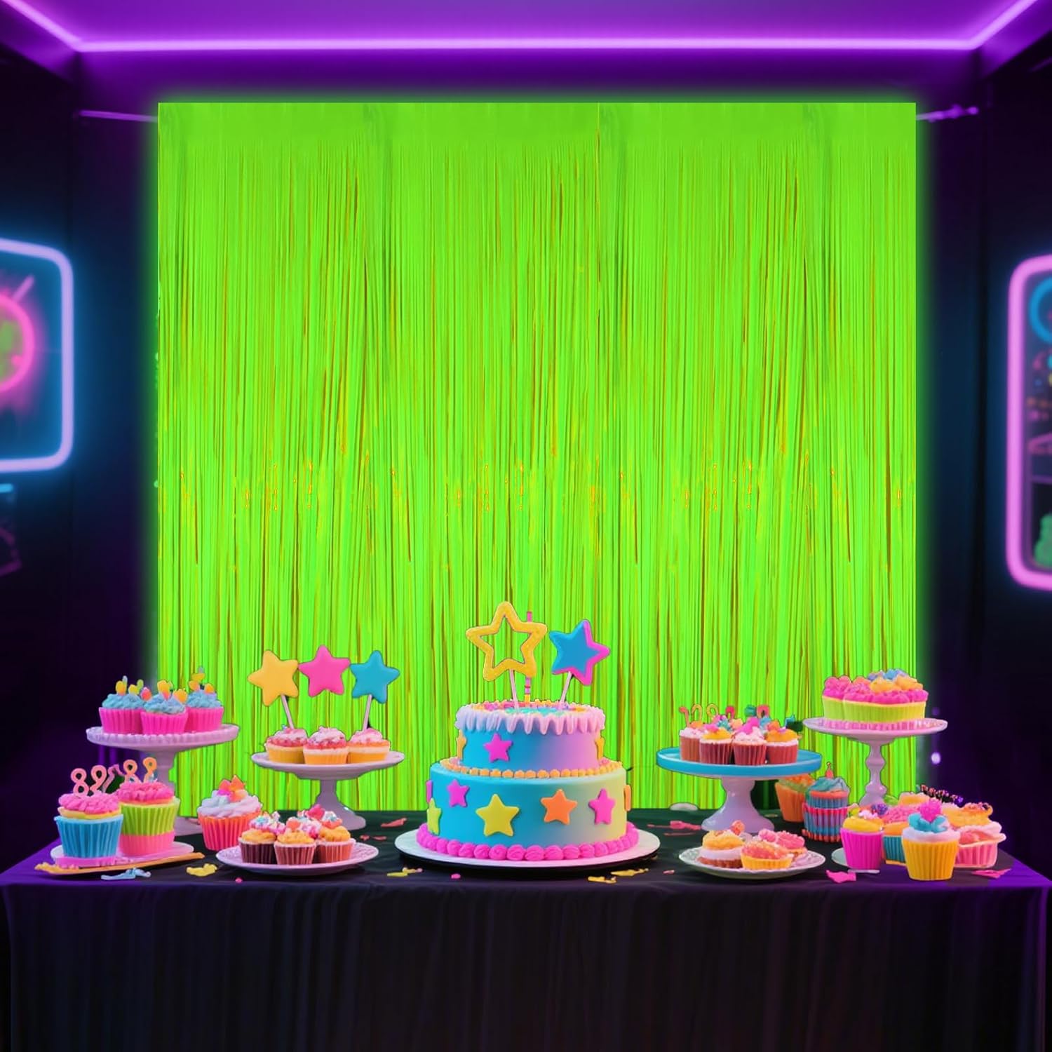 - Glow in the Dark Party Supplies: You will get 4 pcs fluorescent macaron yellow tinsel backdrop, size: 6.6ft*3.3ft. The foil fringe curtains are perfect for blacklight dark glow party decorations, on the door or wall to create an impressive decoration for parties, events, and photo booths.