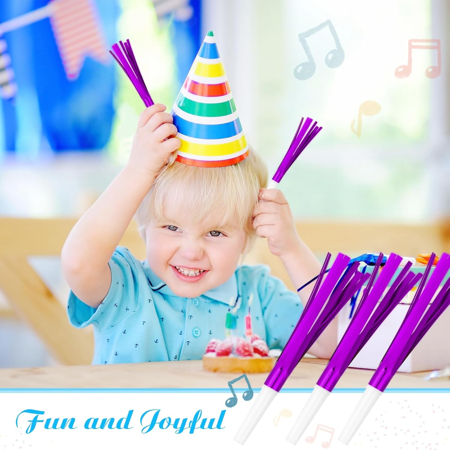 Noise Makers Party Horns, 24 Pack, Purple Metallic Glitter with Fringe, for Birthday, Wedding, New Year