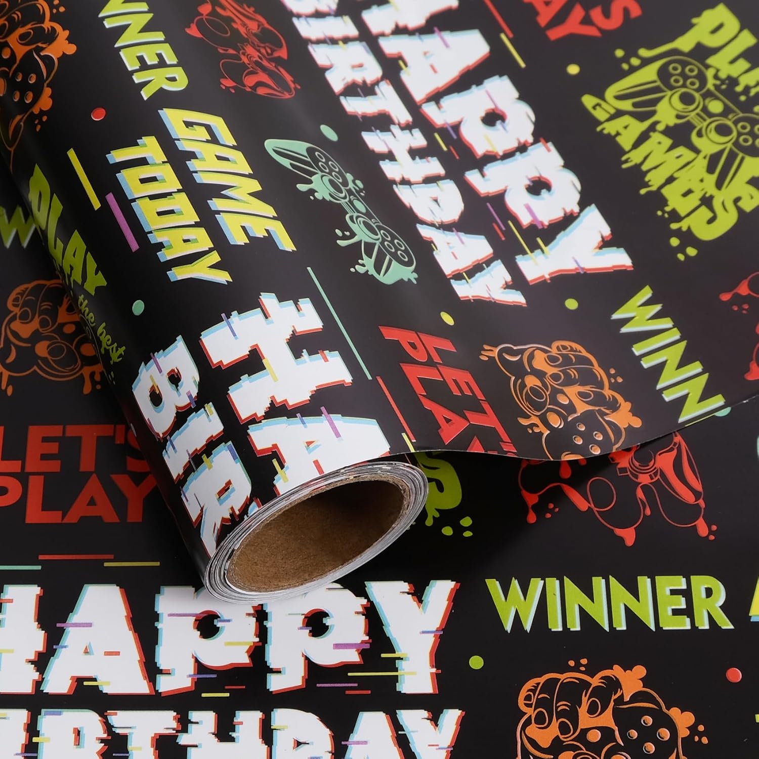 - Happy Birthday Design :This wrapping paper roll with black background, features colorful gaming controllers and "HAPPY BIRTHDAY","GAME TODAY" , "WINNER", "LET'S PLAY", this wrapping paper creates a fun and joyful atmosphere perfect for any celebration