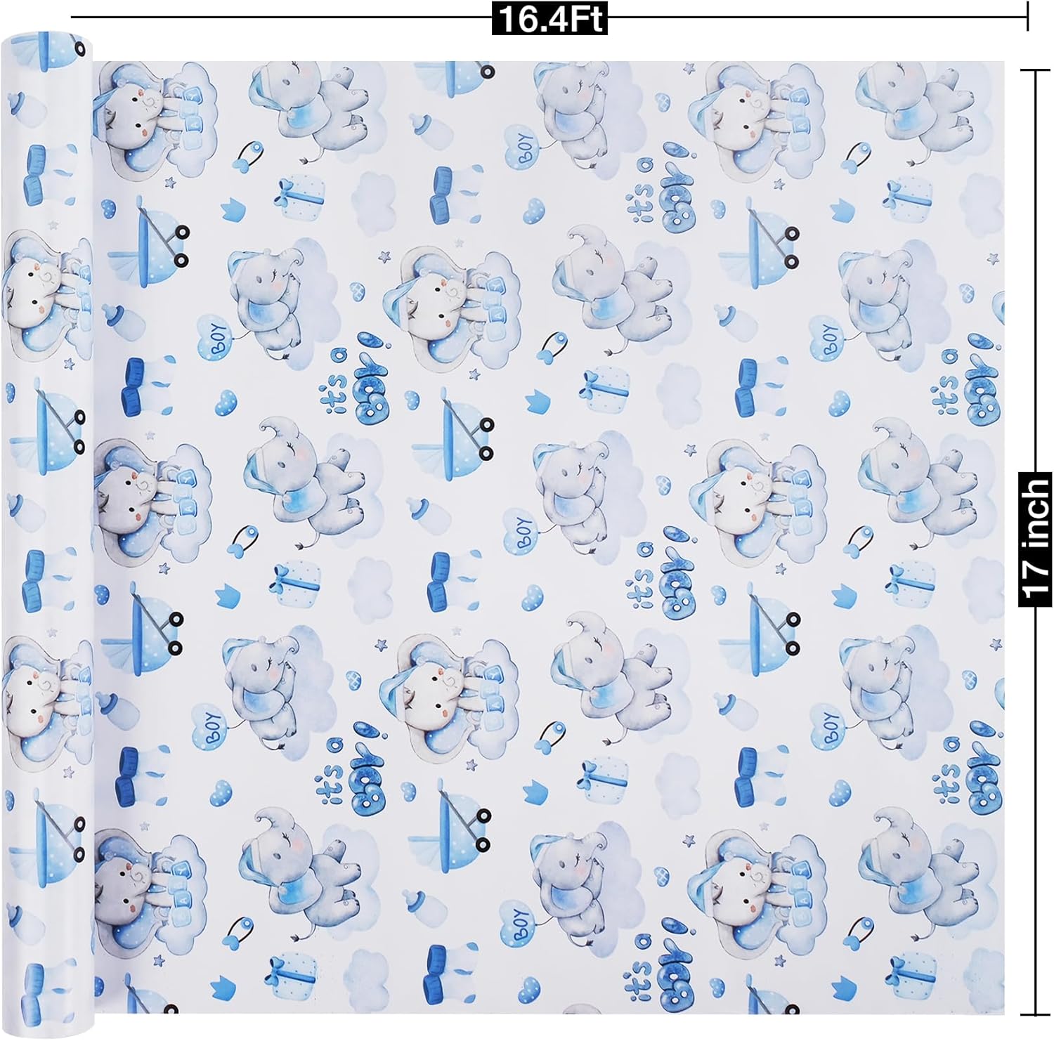 Aimyoo Blue Baby Shower Wrapping Paper Roll - 17 Inch X 16.4 Feet - Cute Elephant with It‘s A Boy Letter Design Perfect for Boys, Birthday, Party