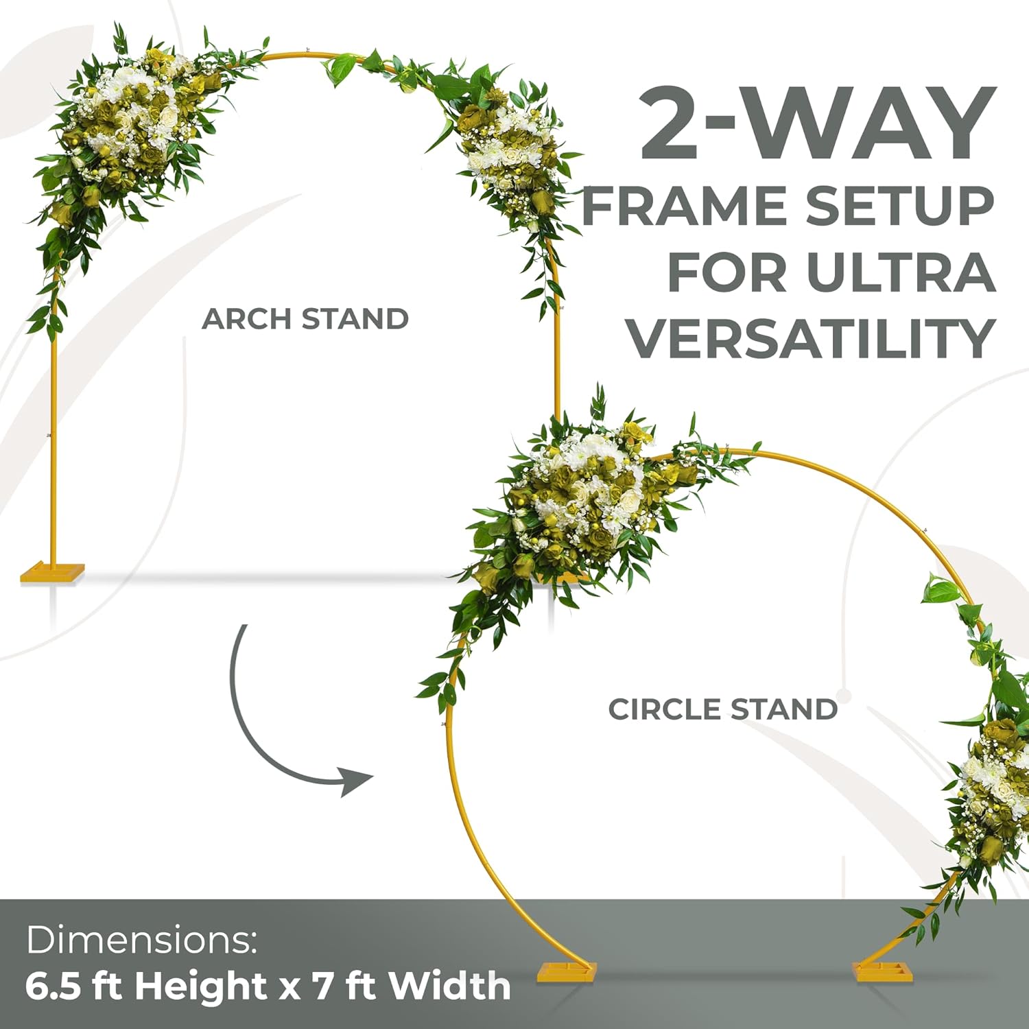 VerdeVista Convertible 6.5 FT Round Backdrop Stand - Heavy Duty Balloon Arch Stand with 2 Waterbags - Multiuse Photo Backdrop Arch, Gold Circle Ring Balloon Arch Frame for Wedding Baby Shower & More