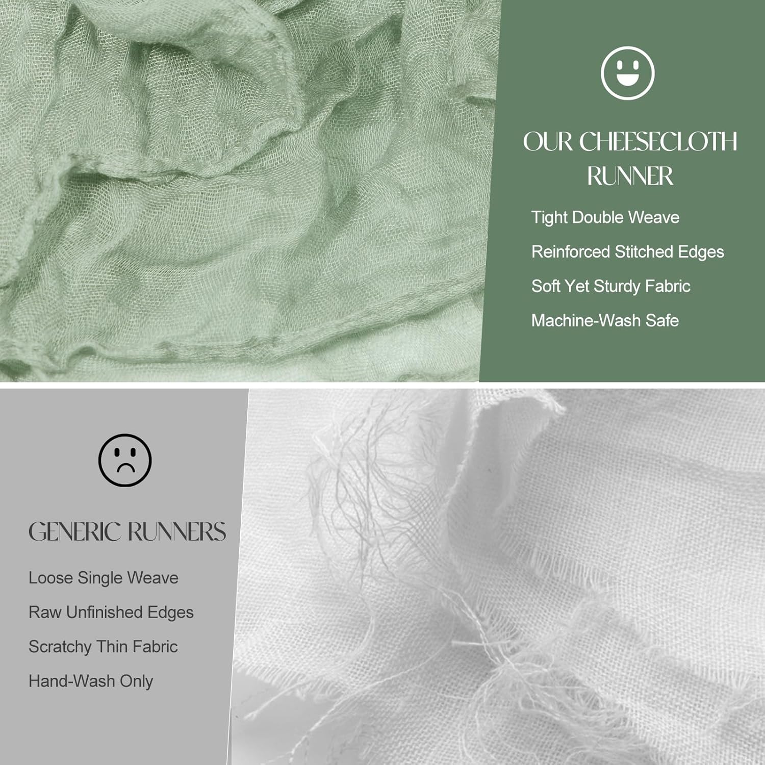- ULTRA-SOFT CHEESECLOTH FABRIC---Crafted from premium, breathable cheesecloth, this table runner delivers a luxuriously soft texture that instantly elevates table decor. Its naturally wrinkled design adds effortless rustic charm—no ironing required! Perfect for delicate celebrations like bridal showers, baby shower decorations, weddings, birthdays, or holiday gatherings (Easter, Thanksgiving, Christmas).