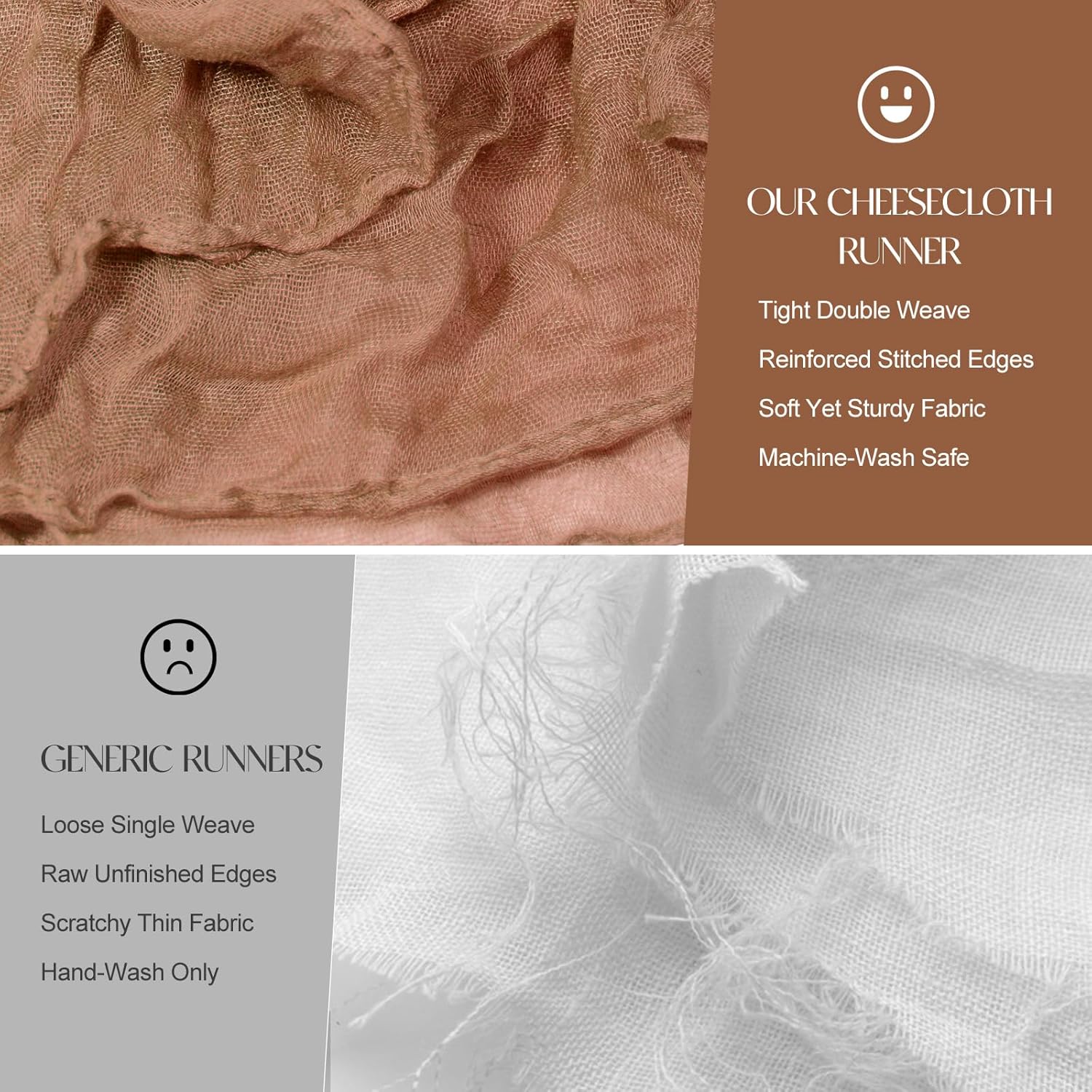 - ULTRA-SOFT CHEESECLOTH FABRIC---Crafted from premium, breathable cheesecloth, this table runner delivers a luxuriously soft texture that instantly elevates table decor. Its naturally wrinkled design adds effortless rustic charm—no ironing required! Perfect for delicate celebrations like bridal showers, baby shower decorations, weddings, birthdays, or holiday gatherings (Easter, Thanksgiving, Christmas).