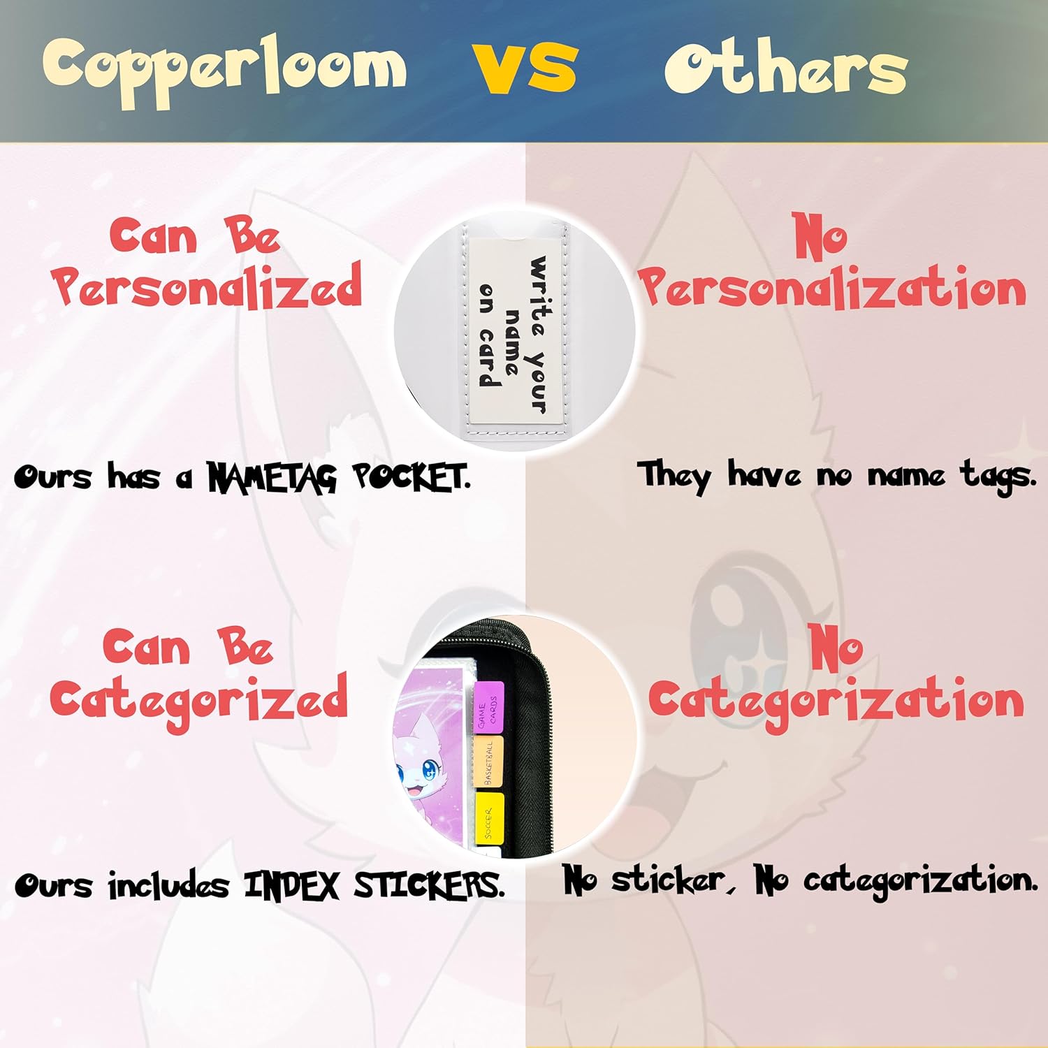 - 【MULTIFUNCTIONALITY 】- The Copperloom card book can be used as baseball cards binder, photocard binder, football card binder, basketball card binder, soccer card bincer, sports card binder, hockey card binder, tcg card binder, card collection binder, trading card holder, card storage display case, kpop binder, 4 pocket card binder, gift card binder, seed organizer storage, money saving binder, sticker binder, business card binder.