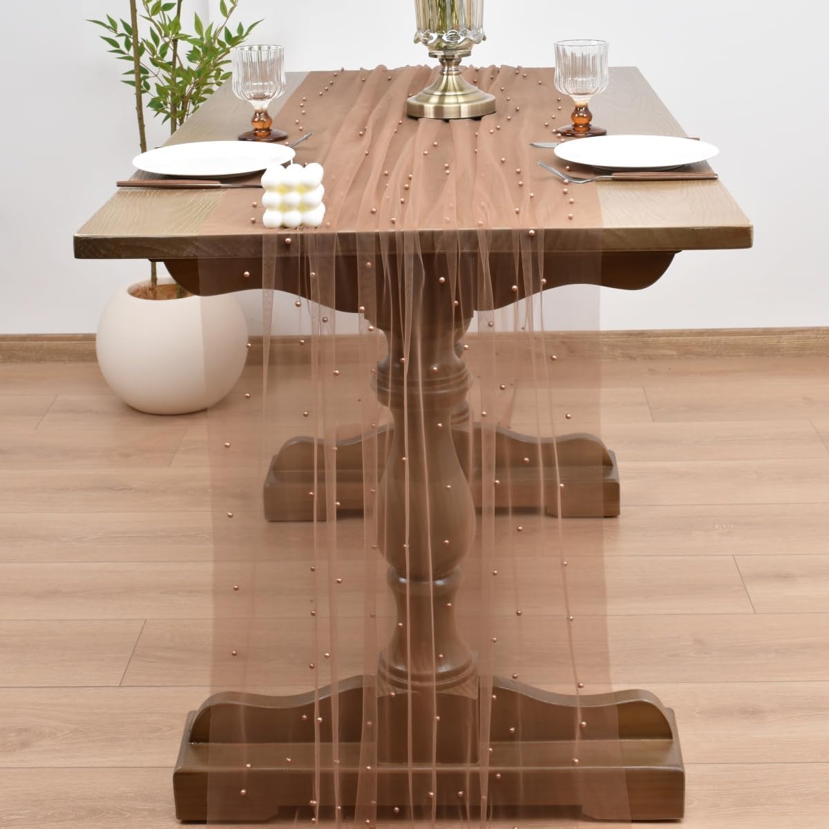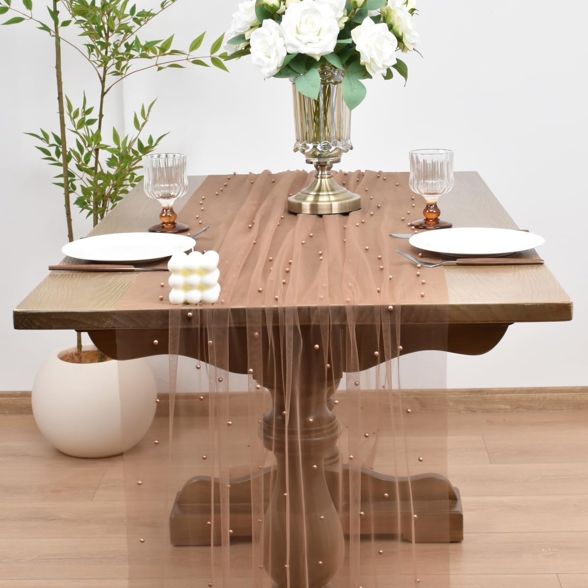 Joanlody Fall Pearl Table Runner 10ft Rustic Boho Tulle Table Runner with Pearls for Baby Shower Wedding Party Veil Dessert Thanksgiving Table Decor Coffee 4pcs