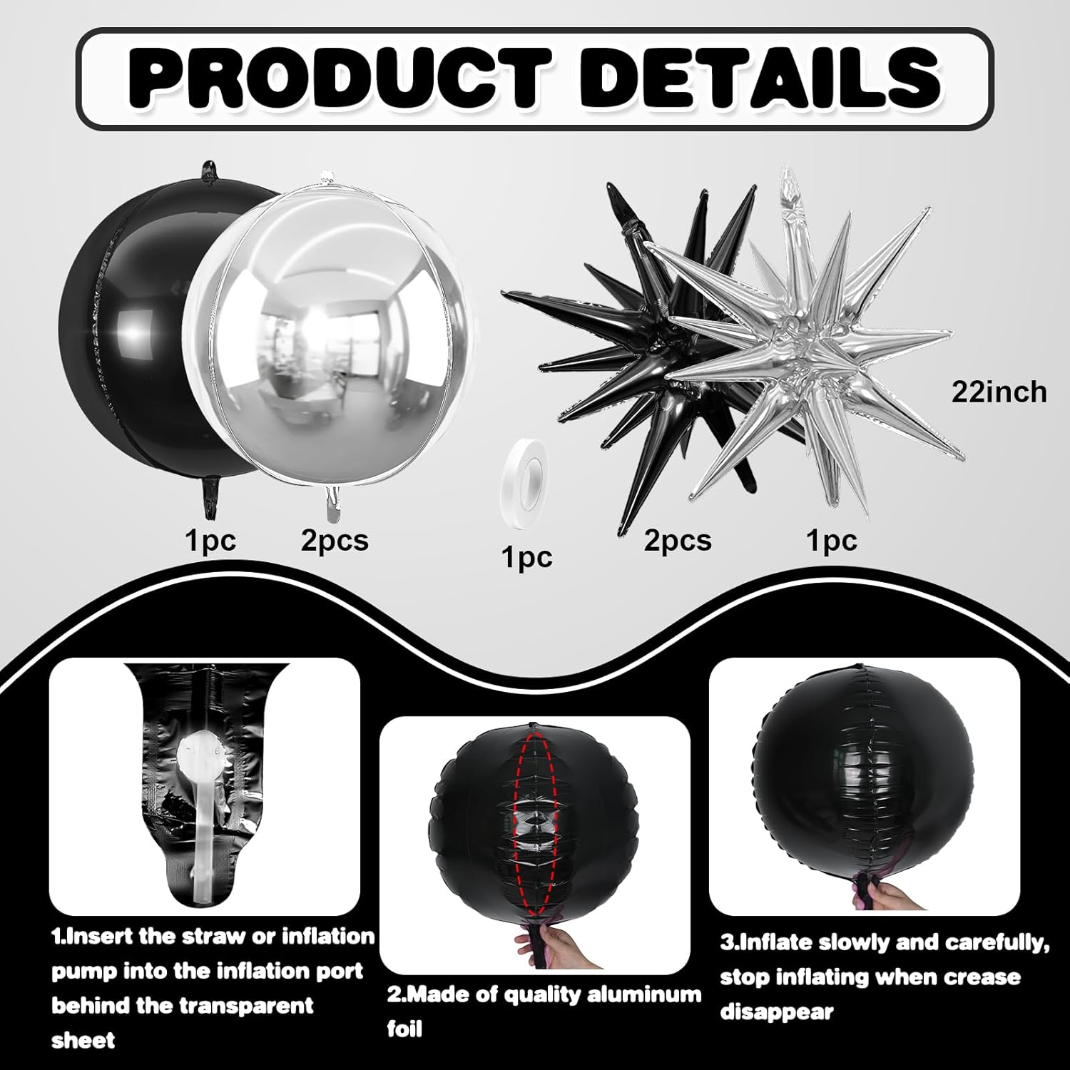 - 【Package】The package includes 3pcs 22Inch 4D ball foil balloons(black x 2,silver x 1),3pcs 22Inch star foil balloons(black x 1,silver x 2),and ribbon.These huge balloons can help you decorate your party better.