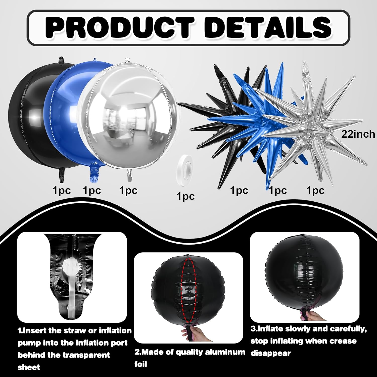 - 【Package】The package includes 3pcs 22Inch 4D ball foil balloons(black x 1,blue x 1,silver x 1),3pcs 22Inch star foil balloons(black x 1,blue x 1,silver x 1),and ribbon.These huge balloons can help you decorate your party better.