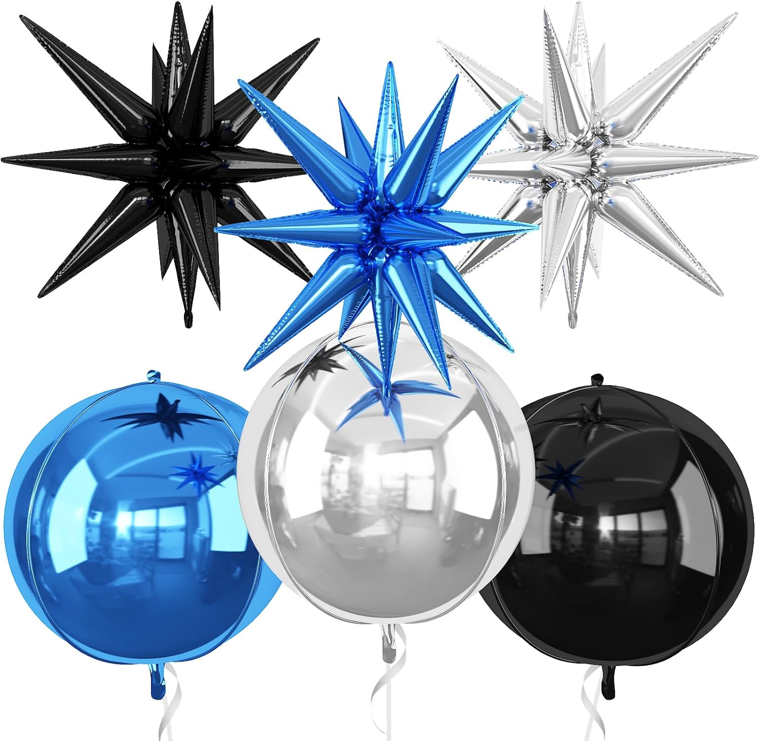 6Pcs Black Blue Silver Foil Balloons,22Inch Black Blue 4D Round Ball Balloon and Explosion Star Balloon for Birthday Wedding Baby Shower Prom Party Anniversary Decorations